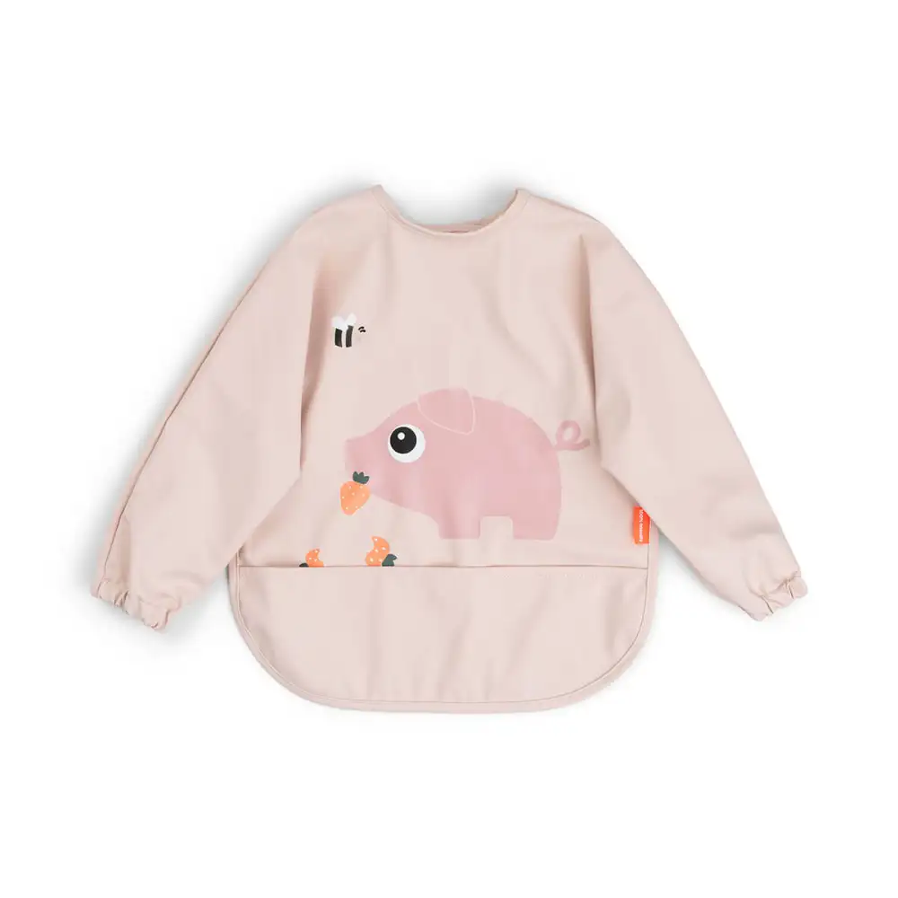 Bavoir à manches avec poche pour récupérer les aliments La surface hydrofuge est facile à nettoyer et protège les vêtements Ajustable grâce aux deux boutons pressions Coloris rose avec le motif rigolo de Pigee