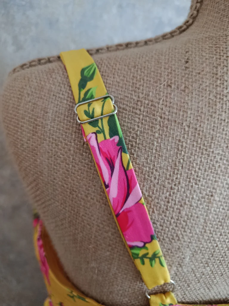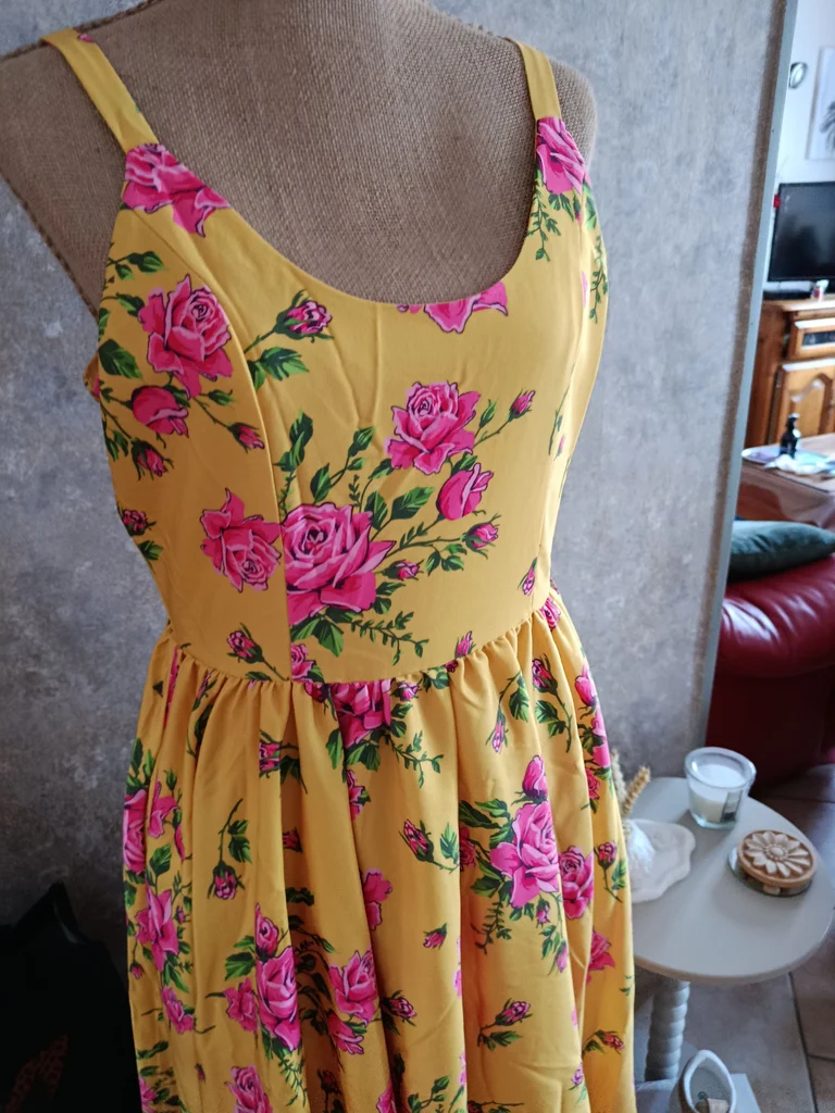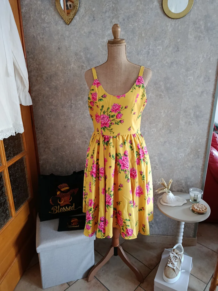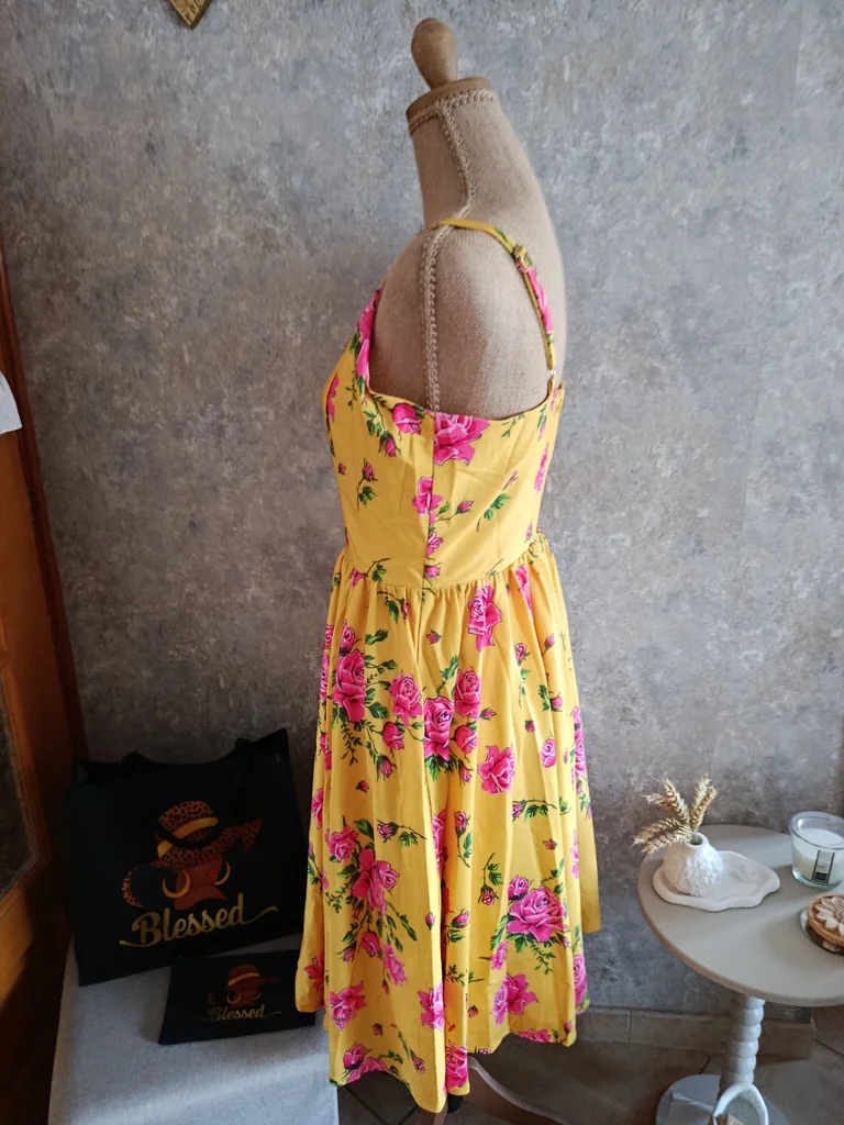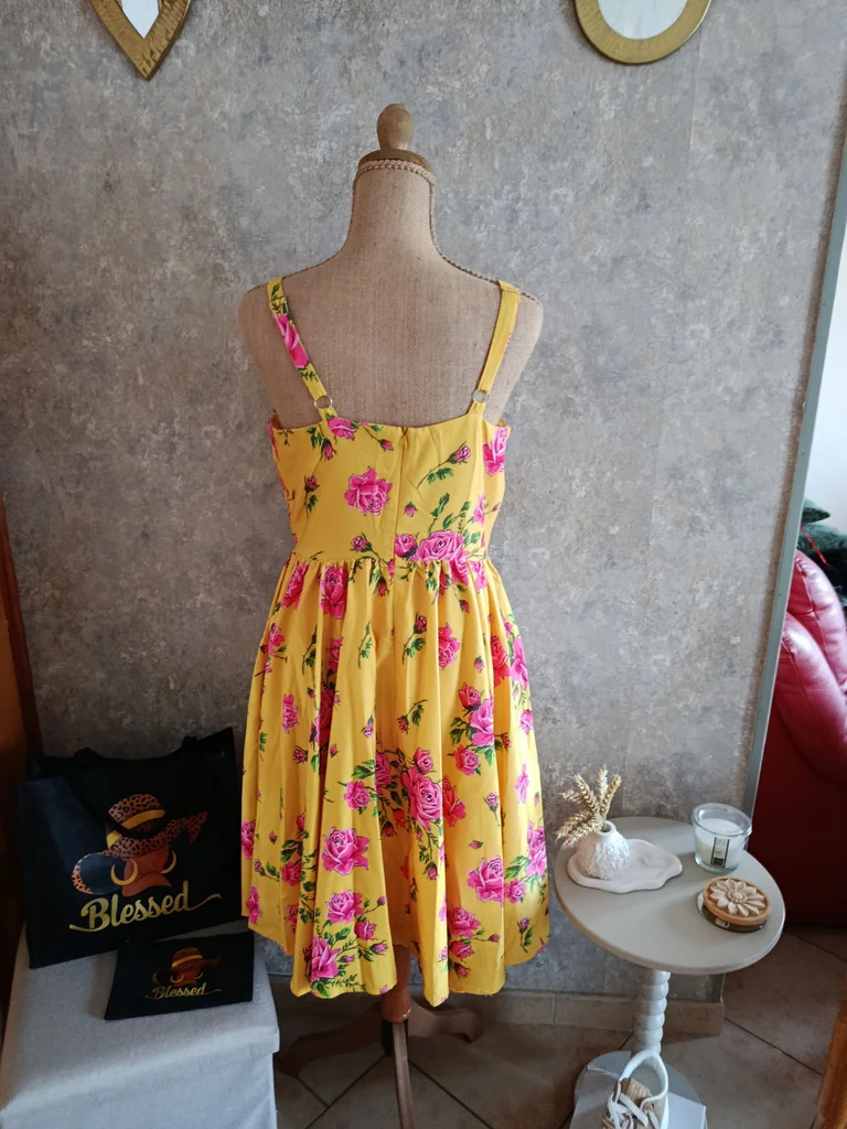 Comme neuve Robe rockabilly pin-up, années 50. Motif fleurs. Ample en bas. Doublée. Zip dans le dos. bretelles réglables. 2 poches. Longueur (totale) : 94cm.environ Couleur : Jaune Composition : 100% Polyester