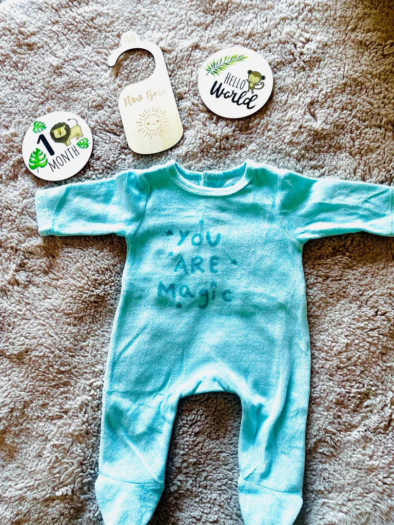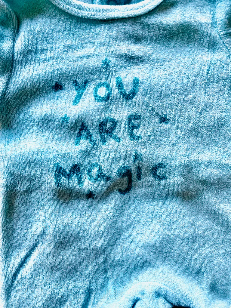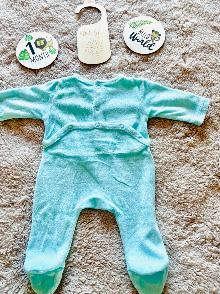 Adorable grenouillère toute douce en velours, taille 0 mois (naissance) 🤍 Coloris bleu clair avec inscription “You are magic” ✨ Très confortable pour bébé, parfait pour les premiers jours 🍼💤 Ouverture pratique à pressions pour habiller facilement 👌 En très bon état ✅ Idéal pour une tenue cosy et mignonne 🌙🧺 Envoi rapide 📦