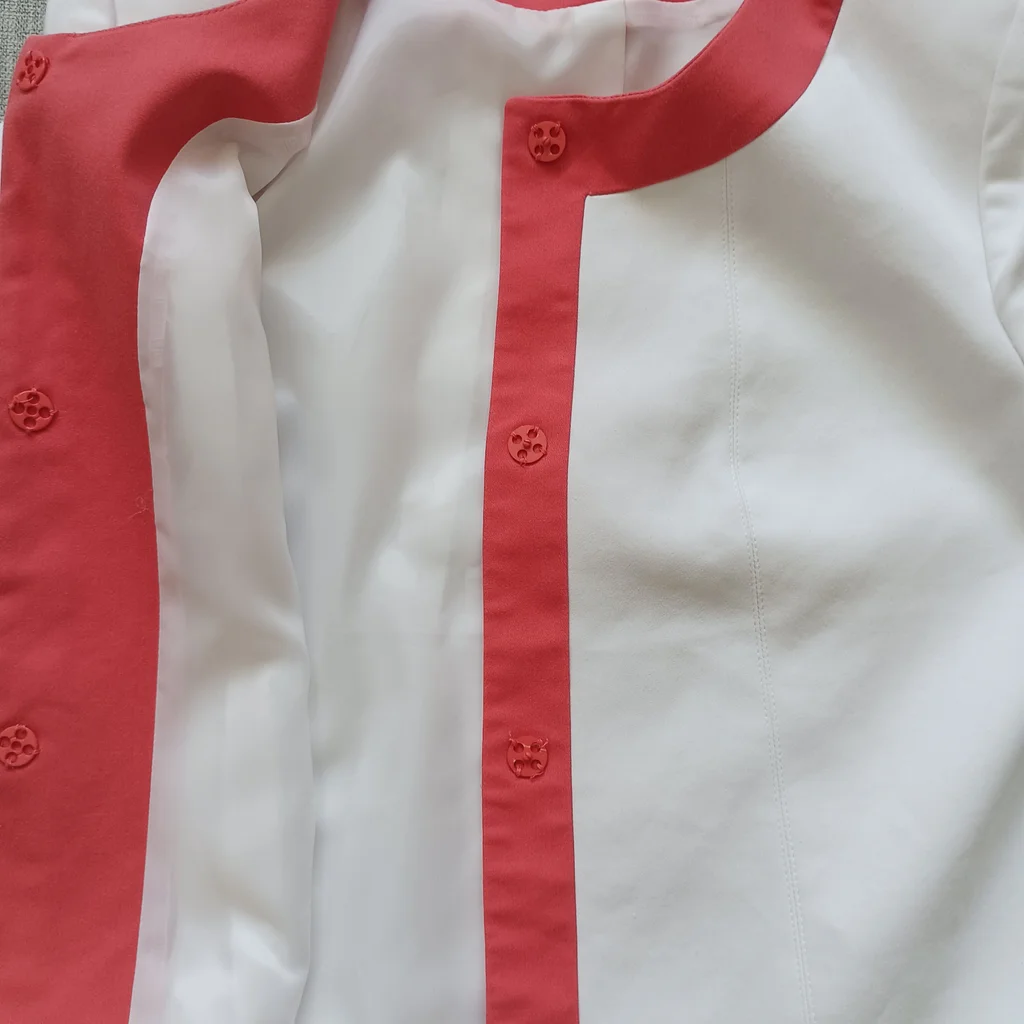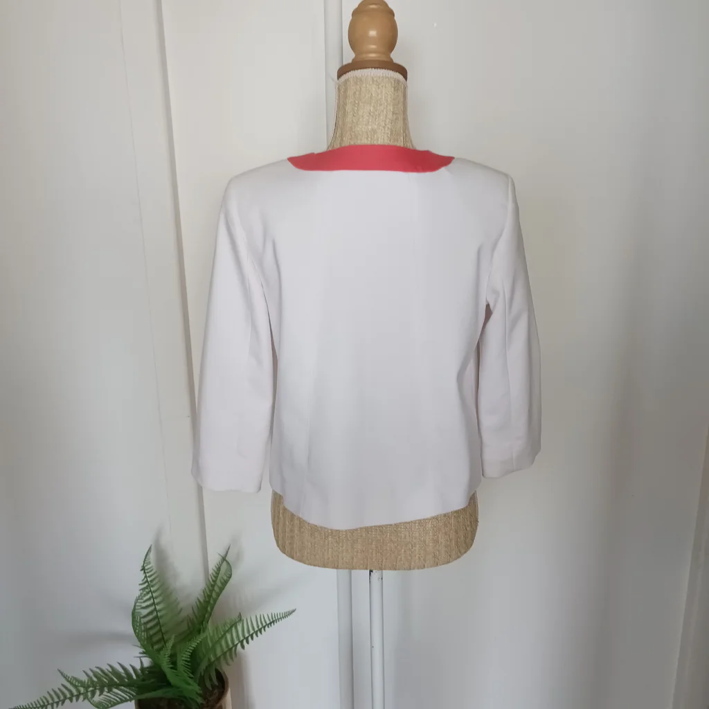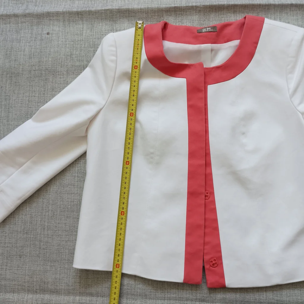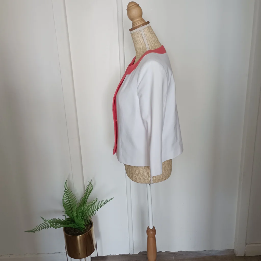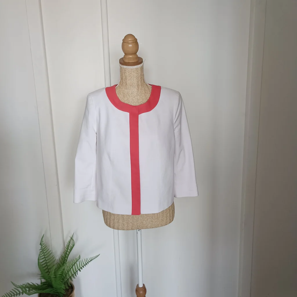 Veste blanche liseré orange , fermeture par gros pression , manches 3/4, taille 40