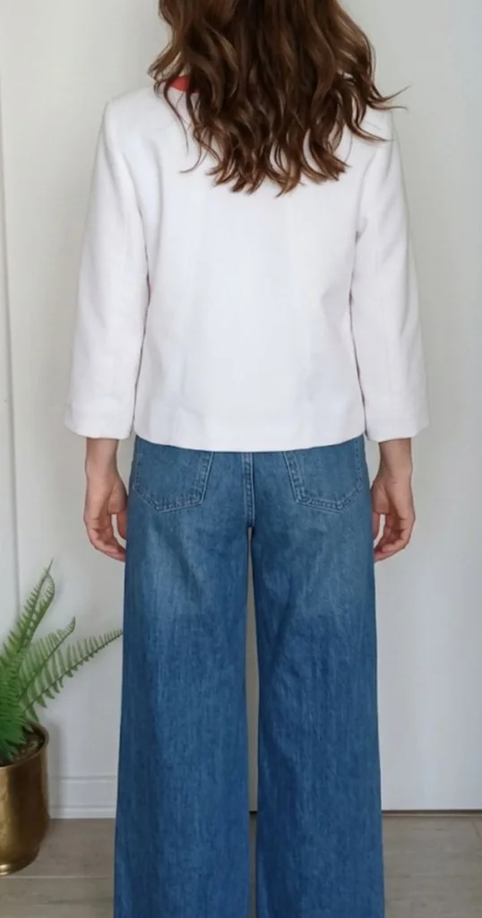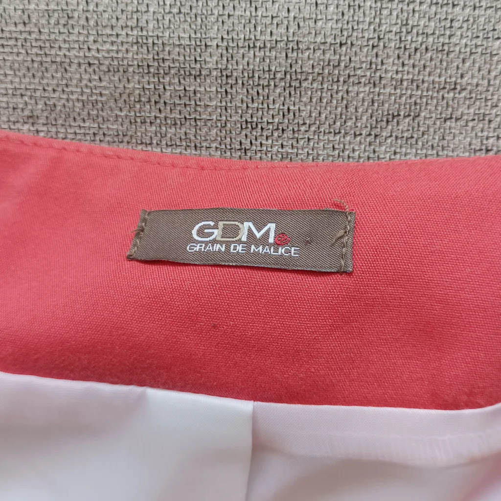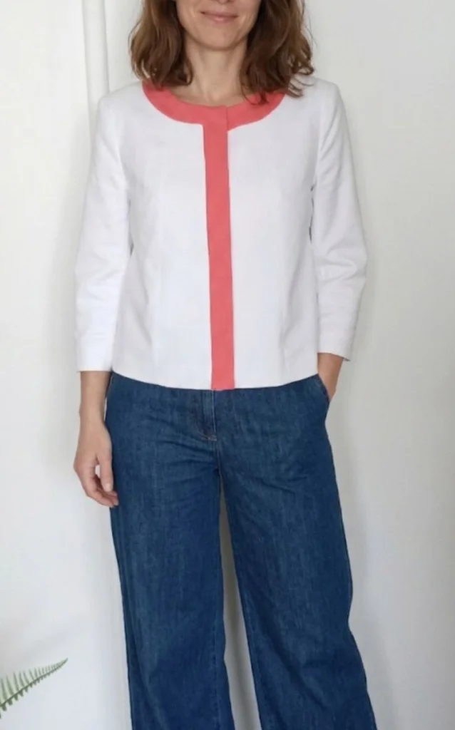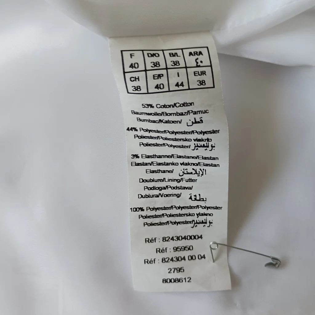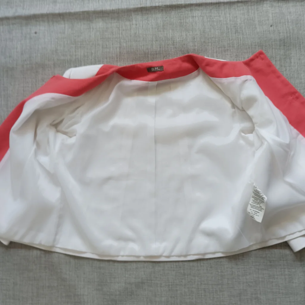 Veste blanche liseré orange , fermeture par gros pression , manches 3/4, taille 40