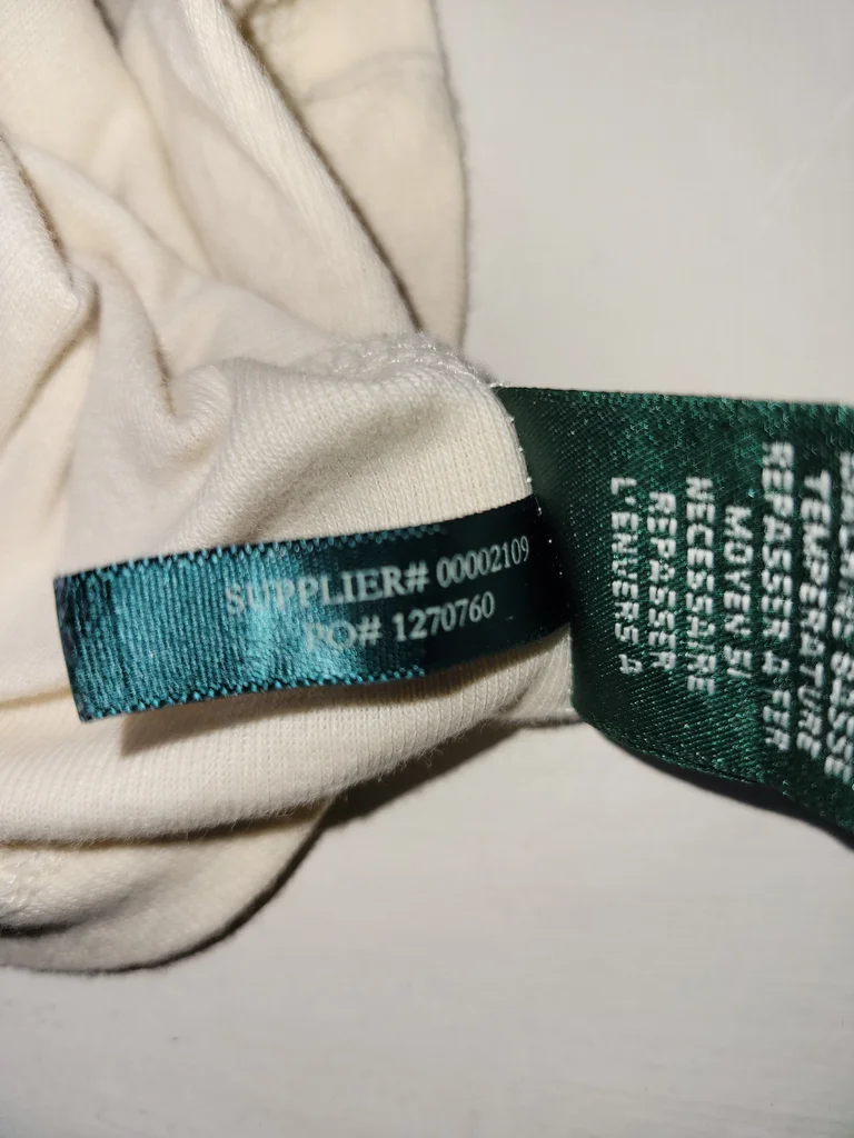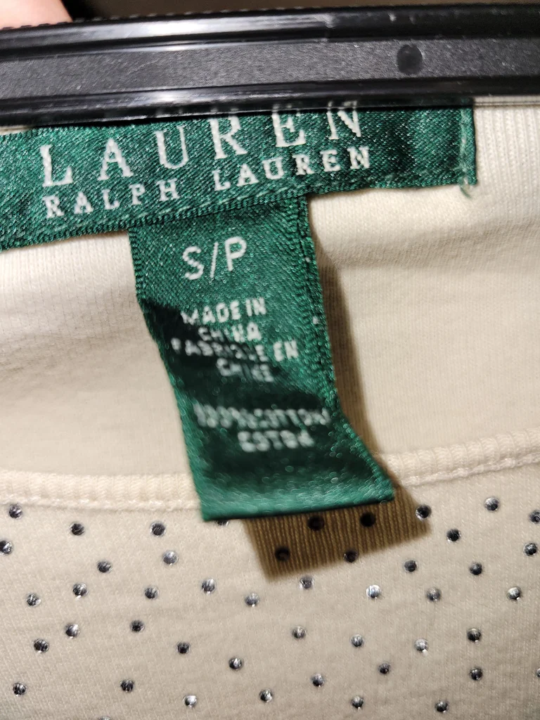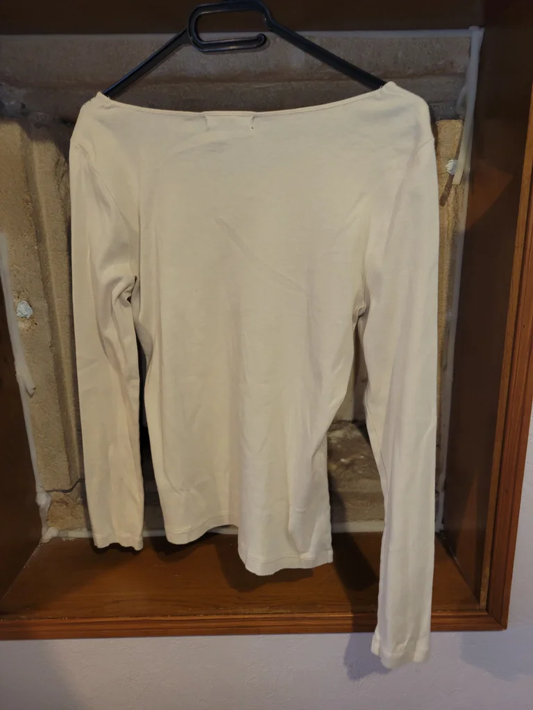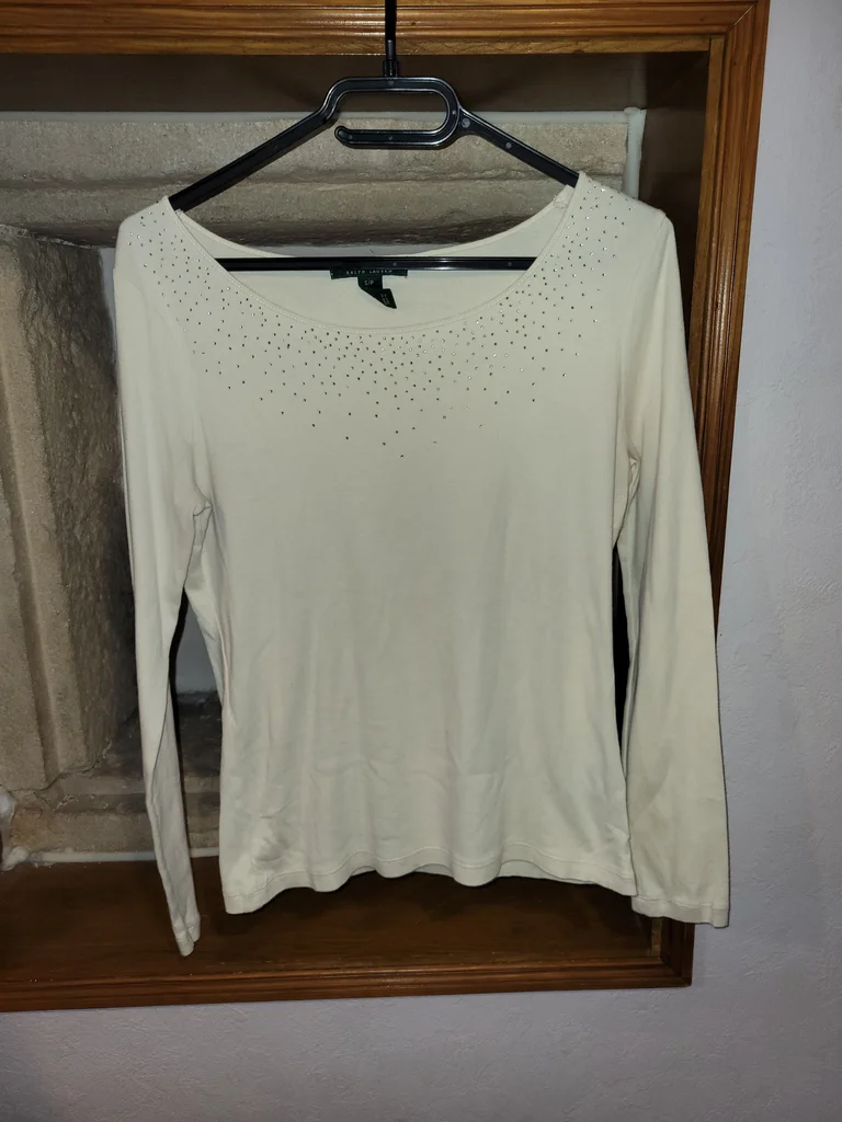 Voici les mesures Épaules a épaules 40cm environ Aisselle a aisselle 46cm environ Longueur totale 57cm environ Je vends ce magnifique haut à manches longues de la marque Lauren Ralph Lauren. C’est une pièce élégante et lumineuse, parfaite pour une tenue chic ou décontractée. Marque : Lauren Ralph Lauren (Authentique, voir étiquette) Couleur : Écru / Blanc cassé Détails : Encolure bateau ornée de délicats strass argentés sur le devant. Matière : 100% Coton (tissu de qualité, doux et confortable). Taille : S (indiqué S/P sur l'étiquette). Et m État : Très bon état génér