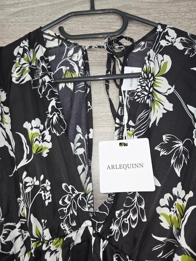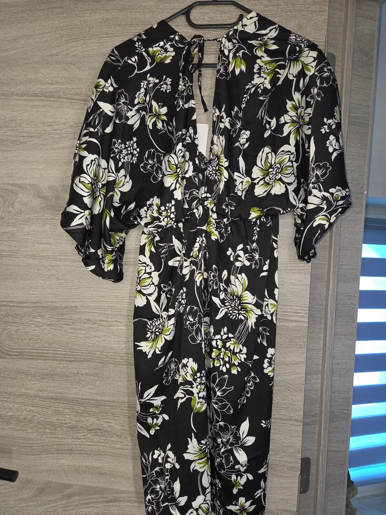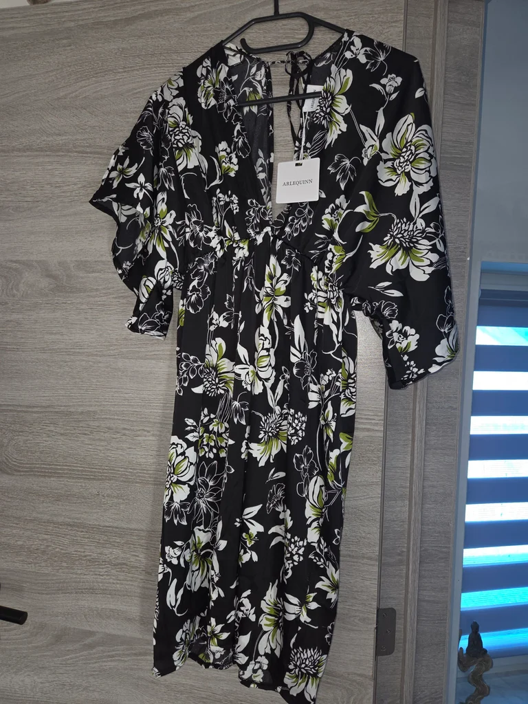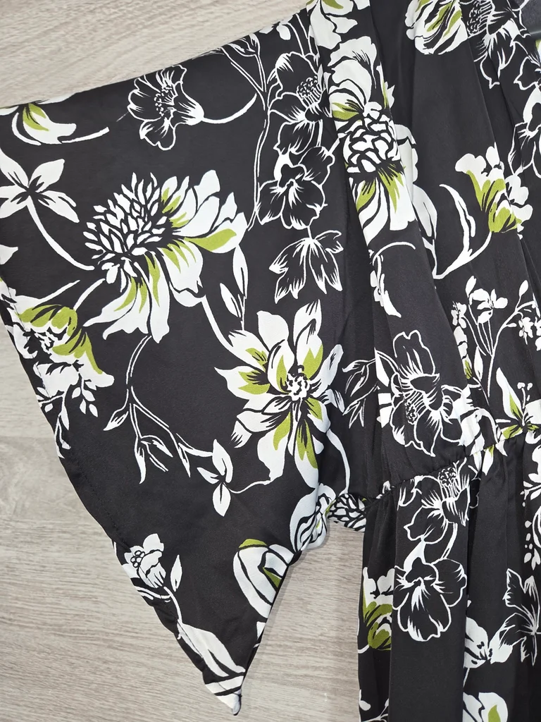 Cette robe est une pièce de style kimono ou bohème, caractérisée par un imprimé floral contrasté sur fond noir avec des touches de blanc et de vert chartreuse. la marque Ablequinn, vous pouvez trouver des robes au style et aux motifs floraux fluides, notamment une robe-chemise en viscose noir-écru floral et une robe courte à manches bouffantes. Taille S/M