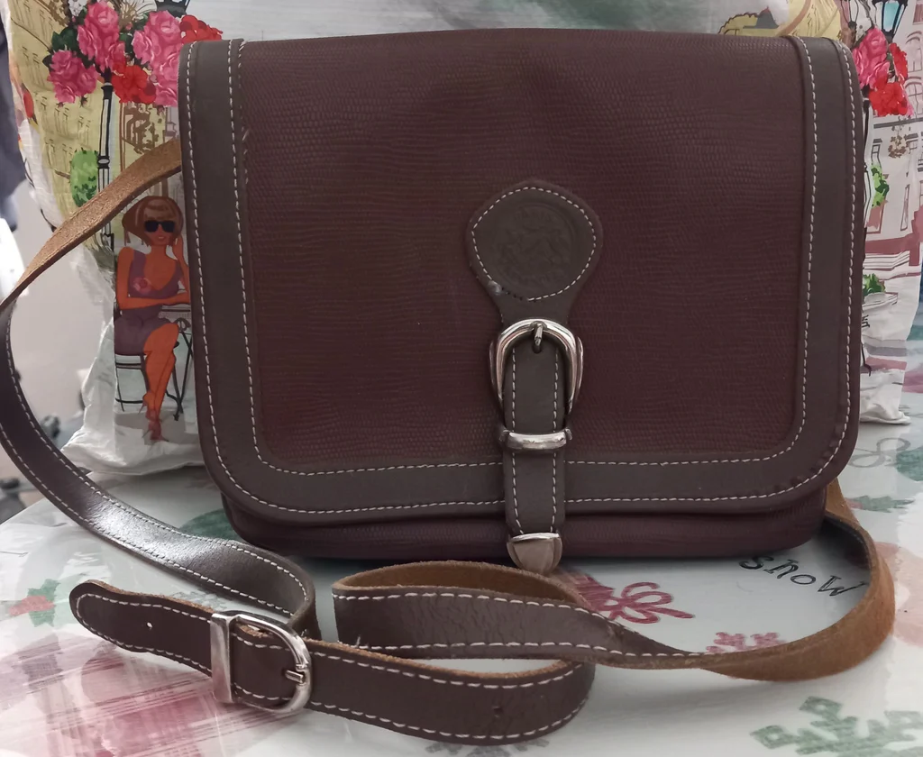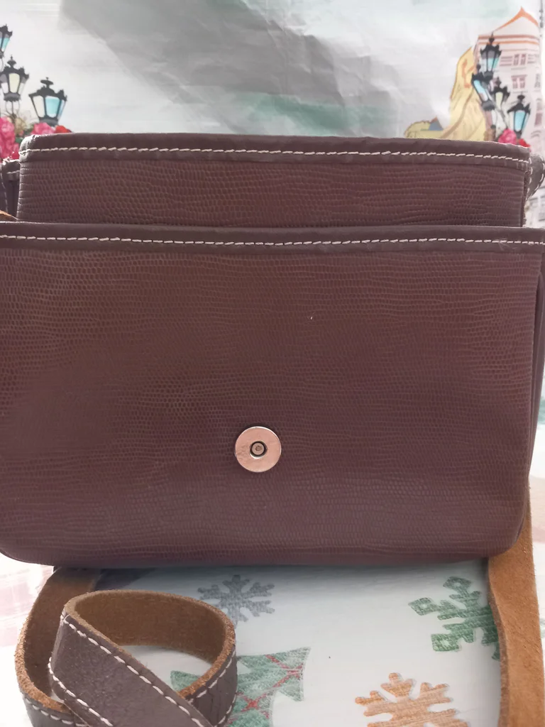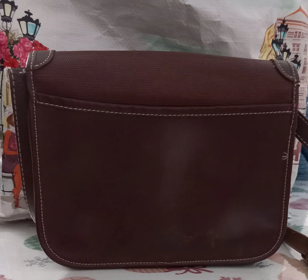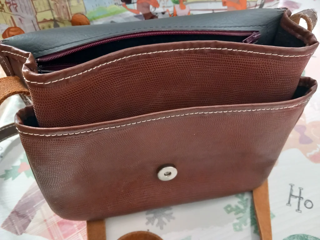 Description : Vends joli sac à main vintage de couleur marron chocolat avec boucle argentée. Style : Intemporel, se porte à l'épaule ou en bandoulière (réglable). Détails : Texture effet cuir grainé/lézard sur le rabat, surpiqûres blanches contrastantes pour un look élégant. État : L'extérieur est en très bon état général. À noter : l'intérieur est abîmé au niveau du haut du sac (voir photos pour plus de détails), ce qui explique le petit prix. Parfait pour un look rétro ou pour un usage quotidien !