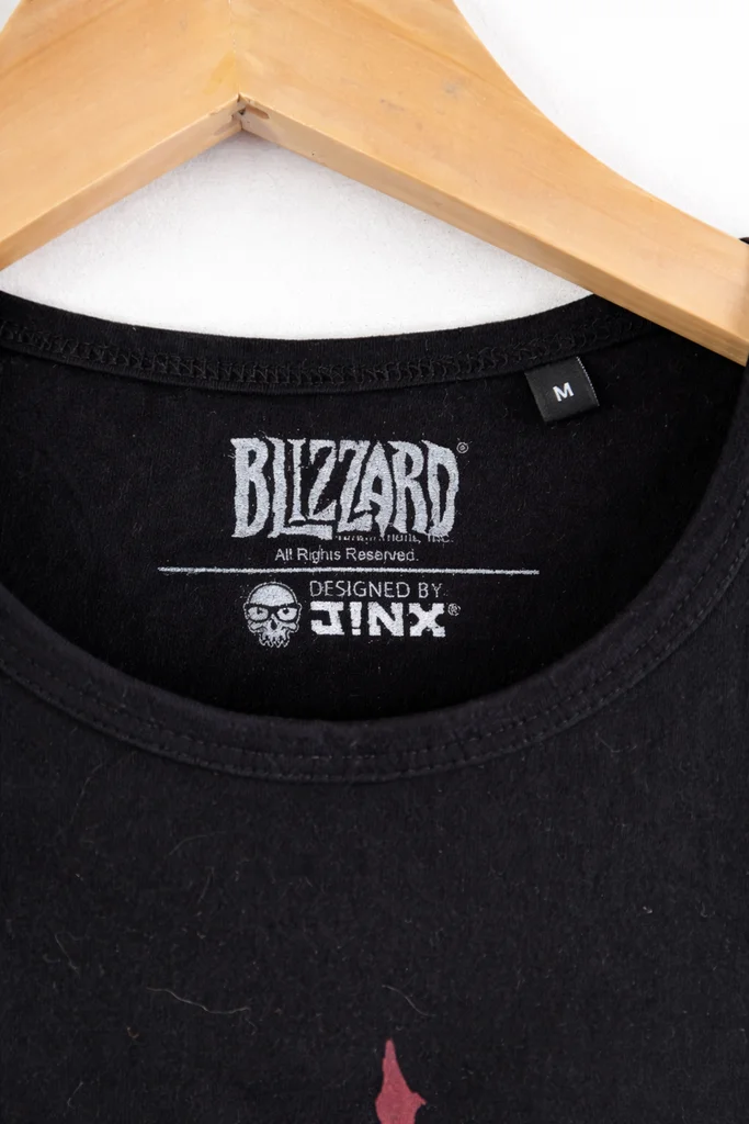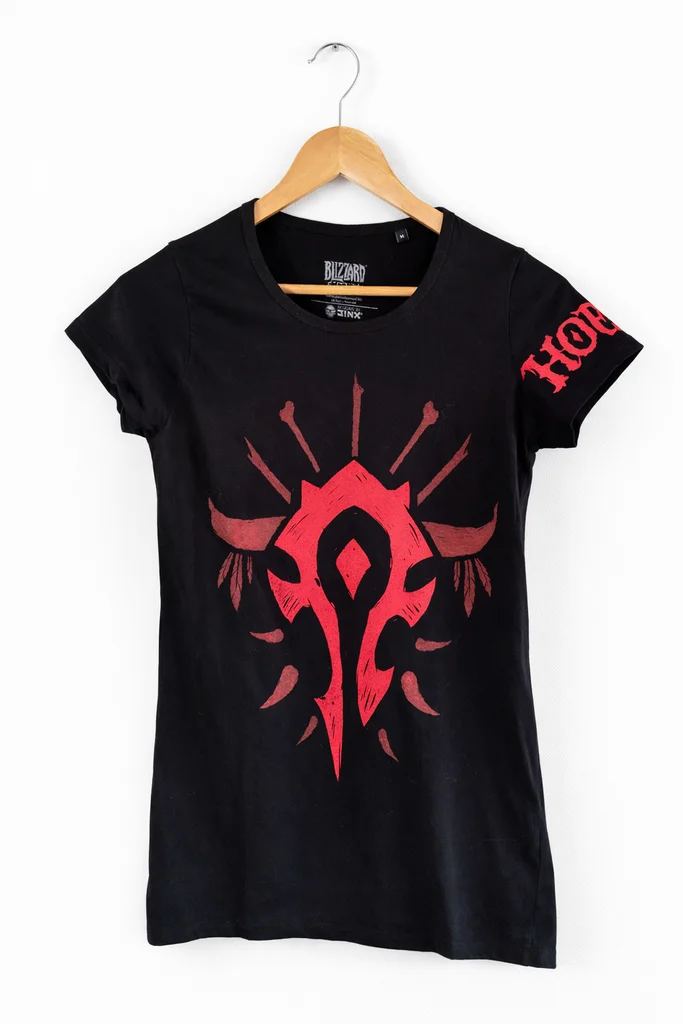 T-shirt noir à manches courtes issu de l’univers World of Warcraft, arborant le célèbre emblème rouge de la Horde sur le devant. Un design iconique pour les fans du jeu, à la fois discret et affirmé. Couleur : Noir avec motif rouge Motif : Logo Horde (imprimé central) + inscription “Horde” sur la manche Col : Rond Taille : M Marque : Blizzard Entertainment / JINX Matière : Coton (souple et confortable) État : Très bon état