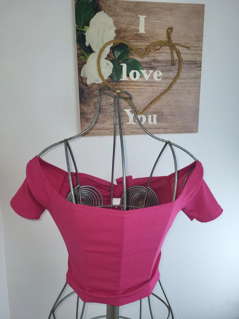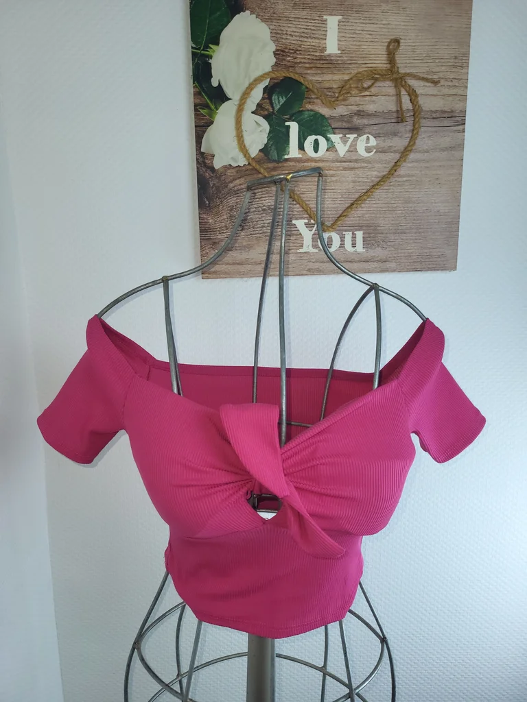 Description : Vends un petit crop top à manches courtes, coloris rose fuchsia vibrant. Un modèle très mignon et féminin avec un joli détail de nœud décoratif au centre de la poitrine. Détails : Taille : Estimée 32/34 (pas d'étiquette, merci de vérifier la mesure). Mesure à plat : Aisselle à aisselle : 35 cm. Manches : Manches courtes simples. Finitions : Petit nœud drapé décoratif à l'entre-seins qui structure le décolleté. Matière : Stretch, très confortable. État : Très bon état. 🚀 LIVRAISON : Envoi via Mondial Relay. Je dépose les colis tous les jours ! ✨ N'hésitez pas à consulter mes autres articles pour créer un lot !