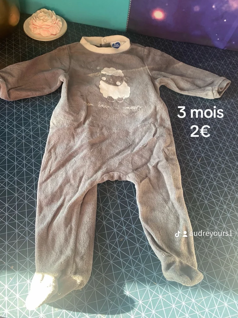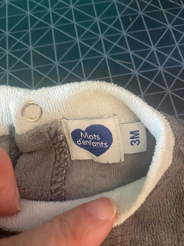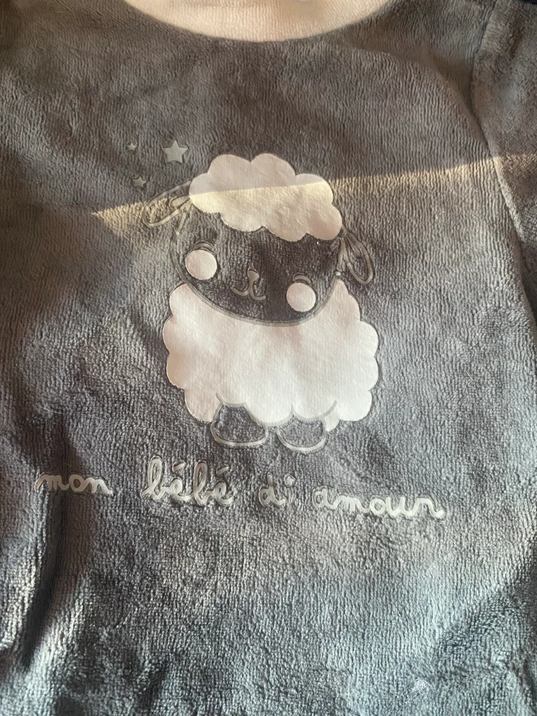 Pyjama bébé Mots d’Enfants – 3 mois – Douceur & poésie ✨ Craquez pour ce charmant pyjama en velours signé Mots d’Enfants, parfait pour envelopper bébé dans un cocon de tendresse 👶🤍 Son coloris gris intemporel, sublimé par un adorable motif mouton et une inscription délicate, apporte une touche à la fois douce et élégante. Idéal pour des nuits paisibles et confortables. ✔️ Taille : 3 mois ✔️ Marque : Mots d’Enfants ✔️ Velours ultra doux, respectueux de la peau ✔️ Pieds intégrés pour garder bébé bien au chaud ✔️ Ouverture pratique à l’arrière ➡️ Très bon état général