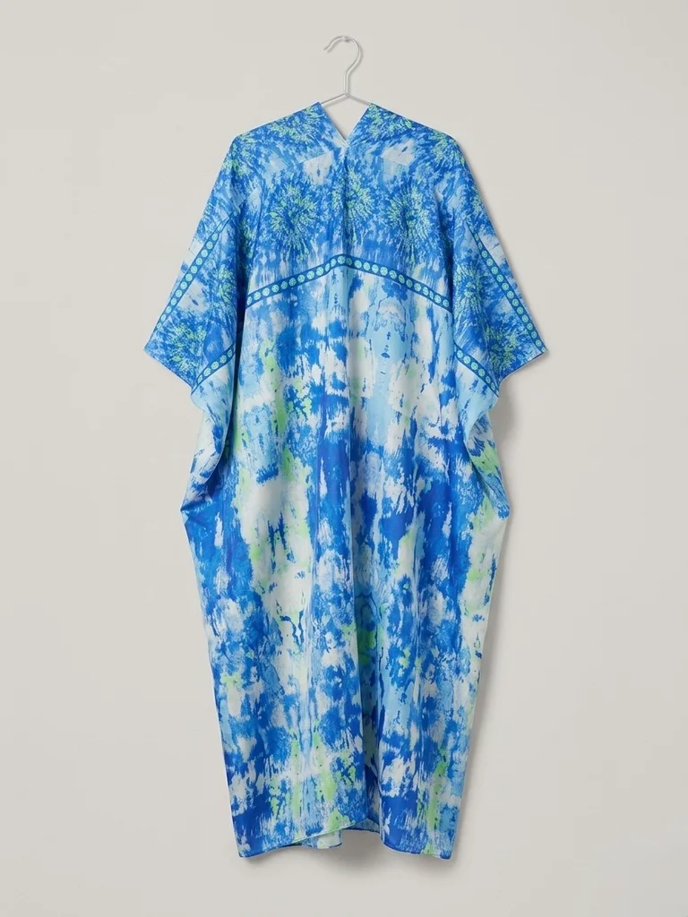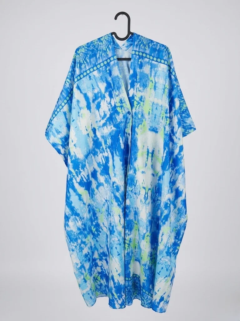 Vends ce superbe kimono long (style caftan) aux motifs abstraits et tie-dye. Un mélange de bleu vibrant, de blanc et de touches vert néon pour un look frais et estival ! ☀️ • Coupe : Oversize et fluide, manches chauve-souris. Très agréable à porter, ne froisse pas. • Détails : Jolie bordure graphique sur les épaules et le dos. • État : Excellent état, très peu porté. • Taille : Taille unique (convient du 36 au 44/46 sans problème grâce à sa coupe ample). • Matière : 100% Polyester (aspect satiné/soyeux léger). Idéal pour porter par-dessus un maillot de bain à la plage, ou en version urbaine avec un jean et un caraco blanc. 🏝️✨ #kimono #caftan #boho #boheme #tiedye #tunique #tailleunique #beachwear #ete #festival #bleu #fluo #oversize #caftanlong