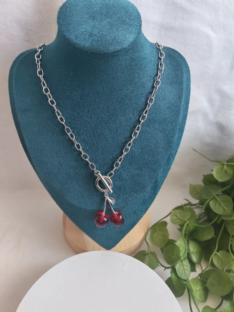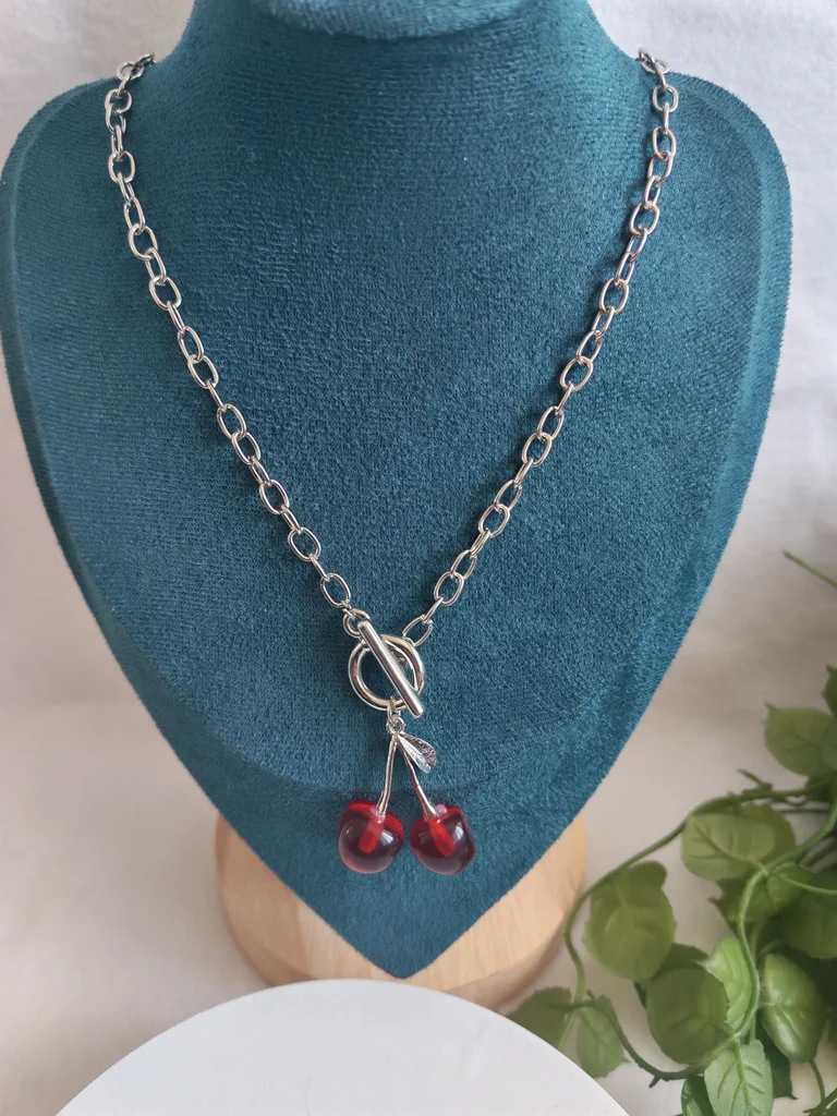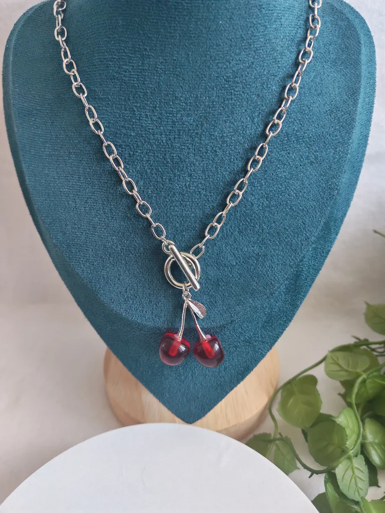Collier femme couleur argente et ses jolies cerises Neuf jamais porté Envoi rapide et soigné Une petite attention dans chaque commande