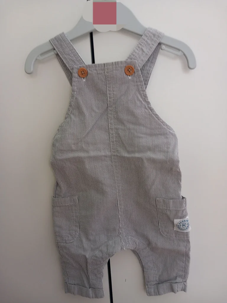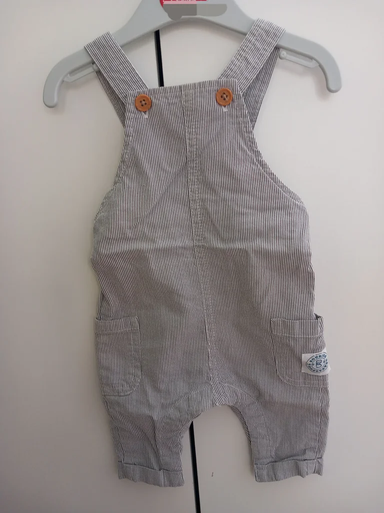 Description État : Très bon état Marque : Gémo Taille : 3 mois Matière : 100% Coton (toile légère idéale pour le printemps/été) Détails du lot : Design : Jolies rayures fines style "milleraies" bleues et blanches (ou grises selon l'éclairage). Un look classique et intemporel. Finitions : * Bretelles ajustables avec boutons aspect bois. Petites poches plaquées sur les côtés. Écusson décoratif sur l'une des poches. Revers cousus en bas de jambe pour un style soigné. Praticité : Ouverture par boutons pressions à l'entrejambe pour faciliter le change.