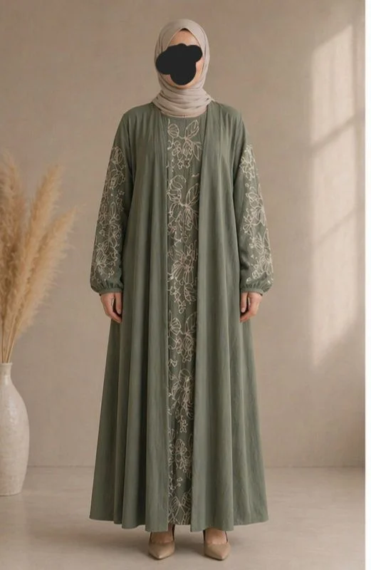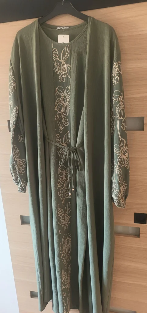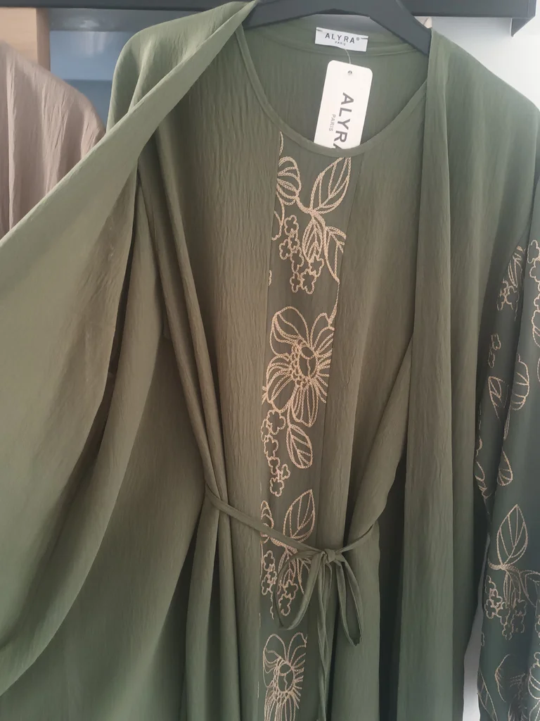 Magnifique ensembles kimono long fluideet robe sans manches avec broderies florales délicates sur les manches du kimono et le devantde la robe. Coupe ample et élégante, idéale pour un look chic et confortable. Manches larges Ceinture fine à nouer Tissu léger et agréable à porter 80 % polyester 20%Coton Taille unique (jusqu'au 44)