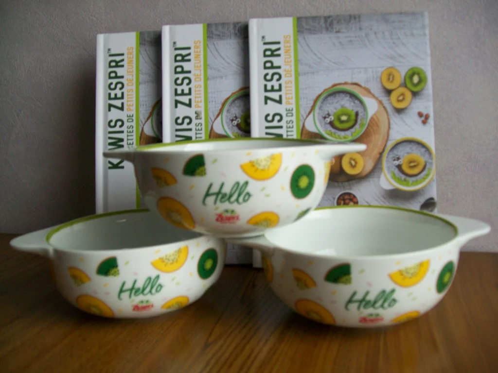 Lot de 3 magnifiques bols à oreilles tendance, illustrés par Oelwein et créés en série limitée. - " Hello " - Diamètre extérieur : 12,5 cm - Diamètre avec les oreilles : 17,6 cm - Hauteur : 5,8 cm - Très belle qualité - Neufs, jamais servi, dans leur emballage individuel. *** Prix non négociable *** Possibilité d'envoi. =================================================================================== *** En cadeau : - 3 petits livres de recettes de petits déjeuners Kiwis Zespri. =================================================================================== * Si cette annonce est en ligne, c'est que l'article est disponible, car je supprime dès la vente effectuée..