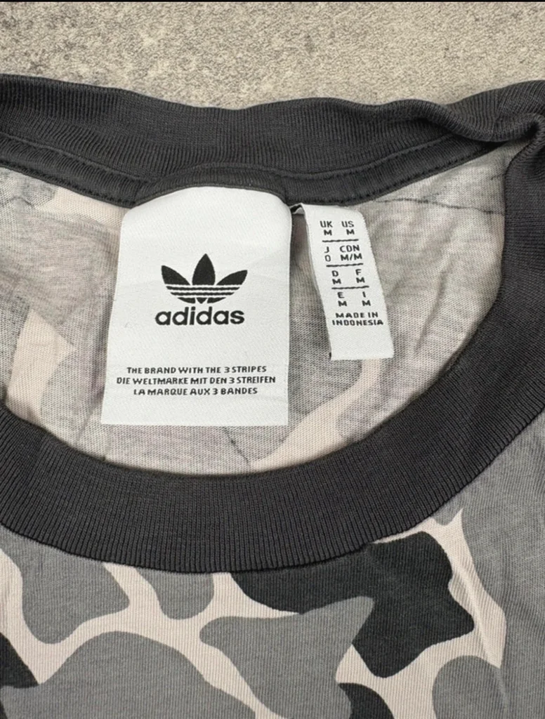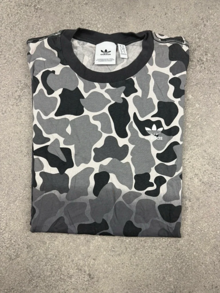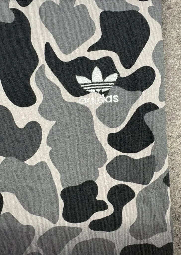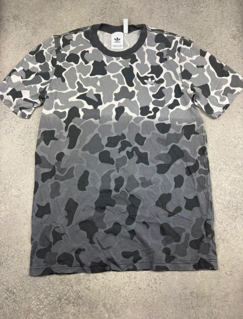 T‑shirt Adidas, taille M, motif camouflage gris/noir avec logo Trefoil imprimé blanc. Coupe regular, Matière douce et confortable, parfait pour un look streetwear, sport casual, ou outfit urbain. Très bon état, tissu propre et sans défaut. ✅ Envoi sous 24/48h ✅ Dimension largeur 52cm longueur 74cm