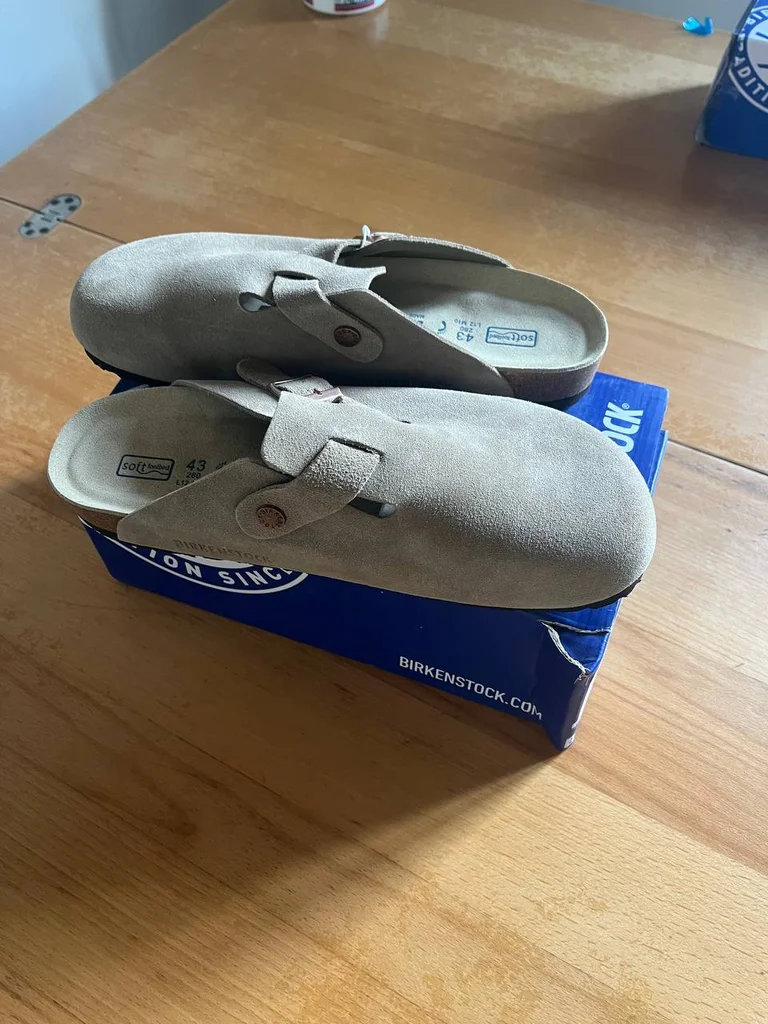 Birkenstock Boston Soft Footbed Coloris : Taupe / Beige Suède Taille : 43 Modèle Boston – mule fermée iconique Dessus suède velours taupe Semelle Soft Footbed premium 🔥 Boucle métal ajustable Semelle liège anatomique Boîte originale incluse ✅ État : [à compléter]