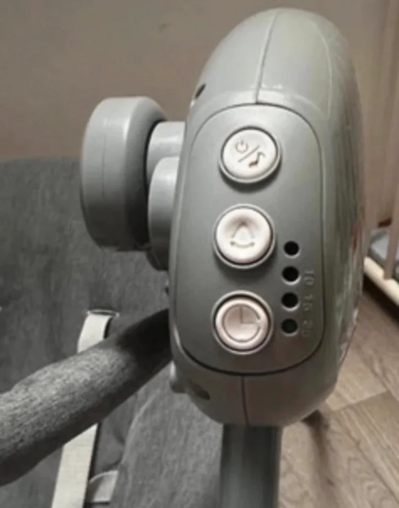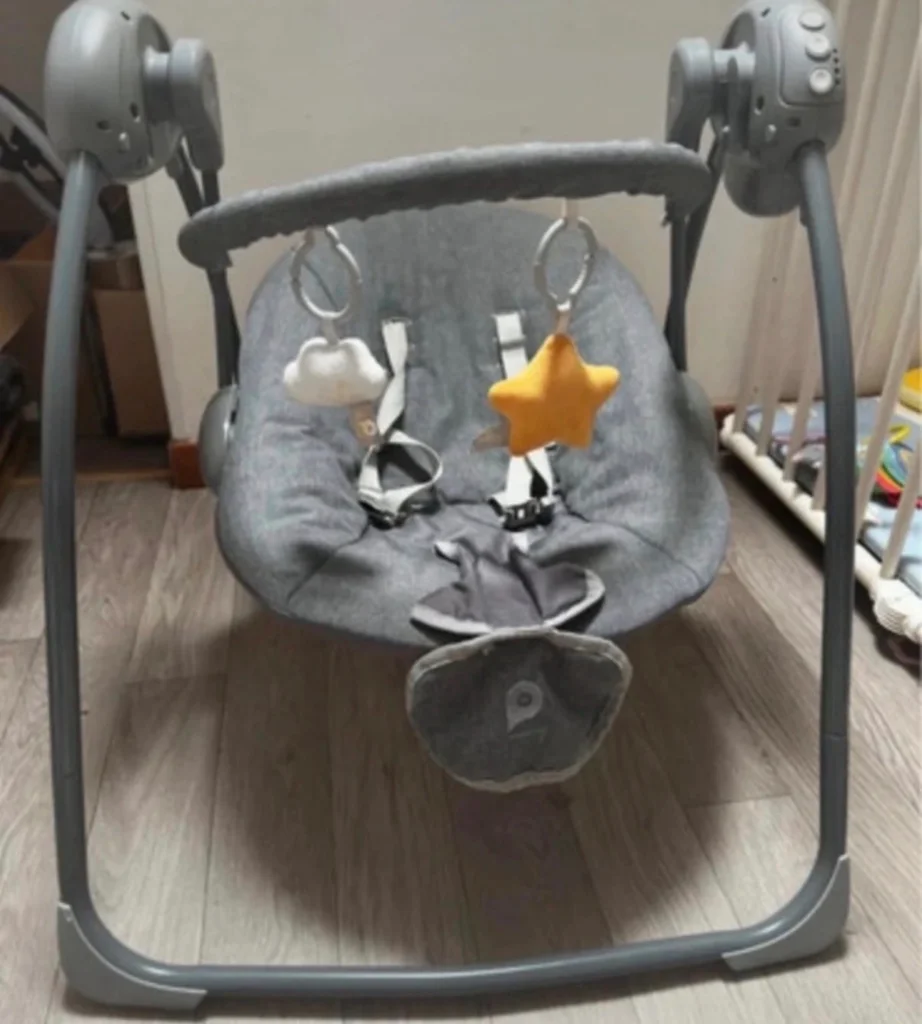 Balancelle à pile superbe Dès la naissance, max 9 kg Harnais : 5 points Arche de jeux : incluse Vitesse : 5 niveaux Musiques : 13 choix Programmateur de durée : 5/15/30 min Fonctionnement : secteur ou 4 piles AA (non incluses) Pliage : compact (55,5 × 23 × 69 cm) Composition : 100% polyester Déhoussable Dimensions : 58 × 68 × 64 cm Poids : 3,5 kg