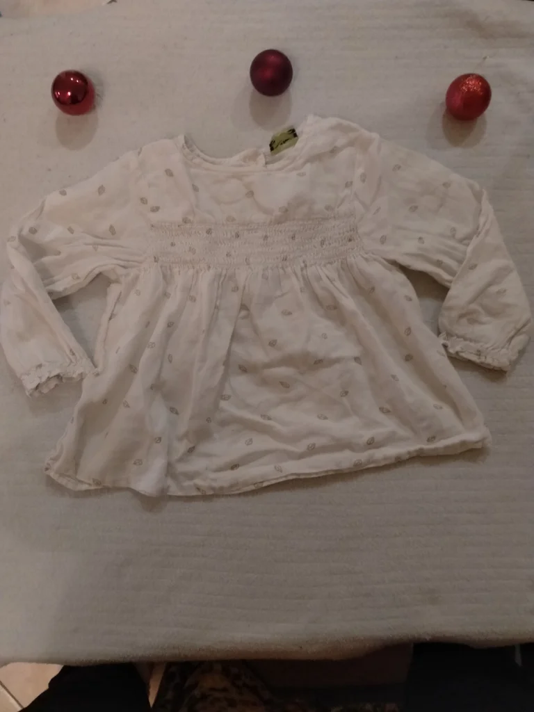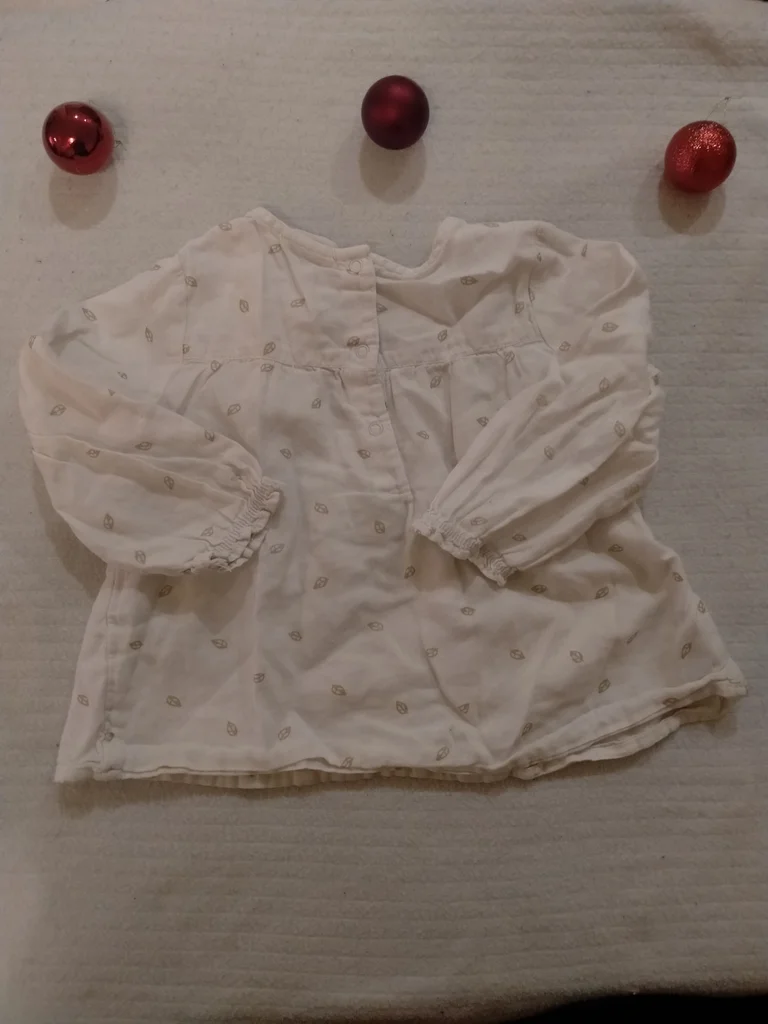 Adorable blouse bébé à manches longues, en 100% coton, douce et confortable pour la peau de bébé. Motif délicat de petites feuilles dorées, très joli et raffiné. Smocks brodés sur la poitrine pour un effet froncé élégant et un tombé impeccable. Fermeture par pressions dans le dos pour un habillage simple et rapide. 📌 Taille : 18 mois / 80 cm 📌 Matière : 100% coton 📌 État : Bon état Une jolie pièce pratique et confortable, parfaite pour le quotidien comme pour une tenue plus habillée ! #vêtementsfille18moissabrinantony72 (20) blouse bébé blouse fille blouse 18 mois coton bébé Tape à l’œil TAO blouse blanche feuilles dorées manches longues bébé top bébé fille vêtement 18 mois blouse smockée tenue bébé fille blouse élégante bébé vêtements enfant fille