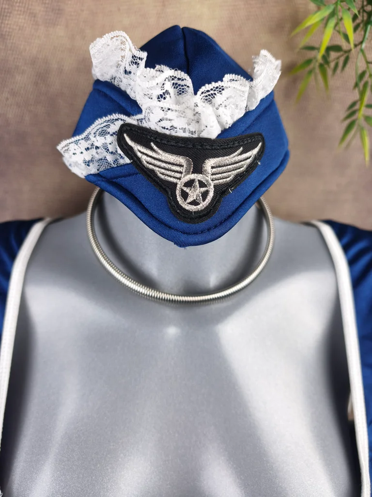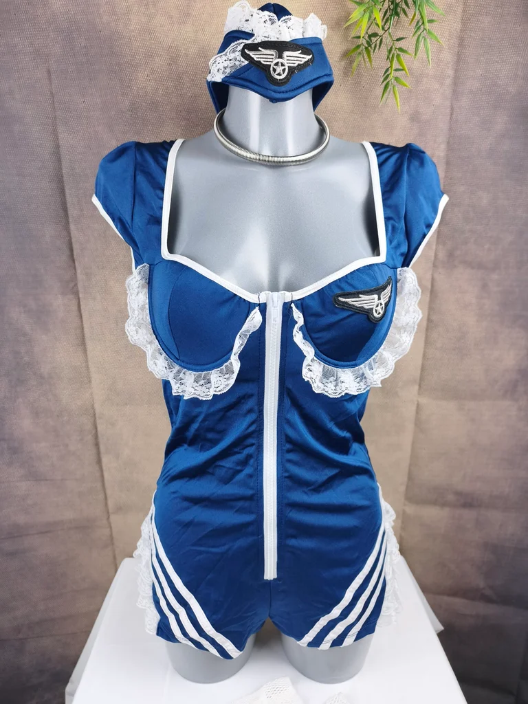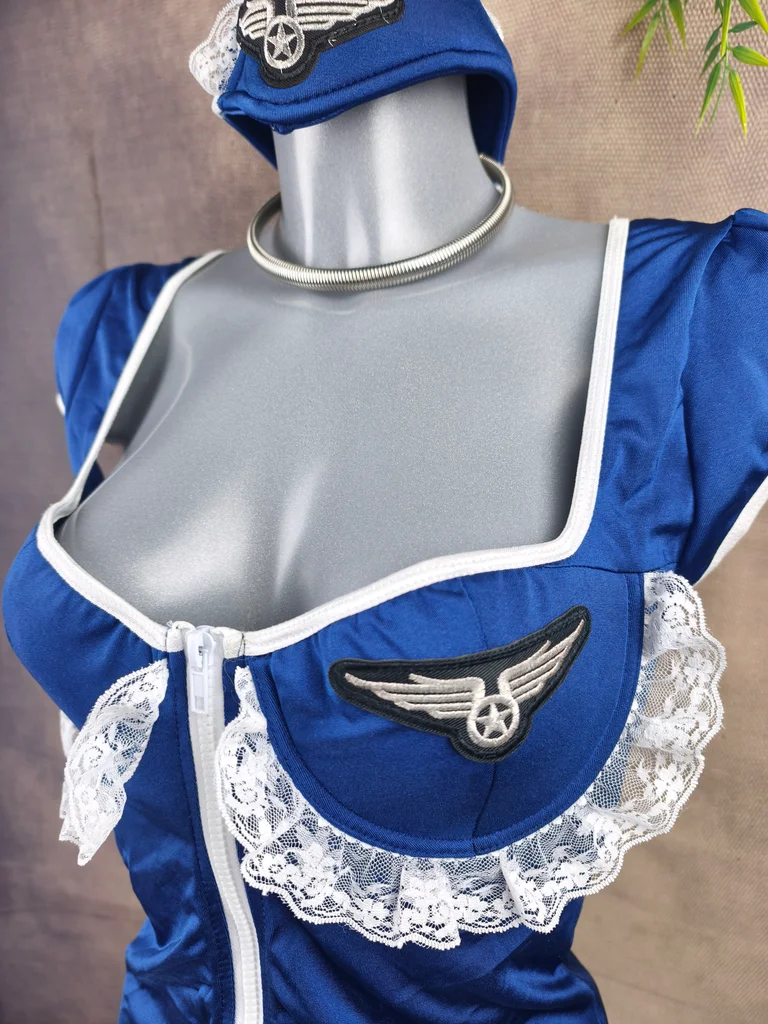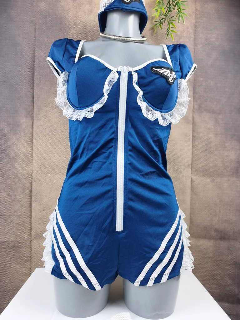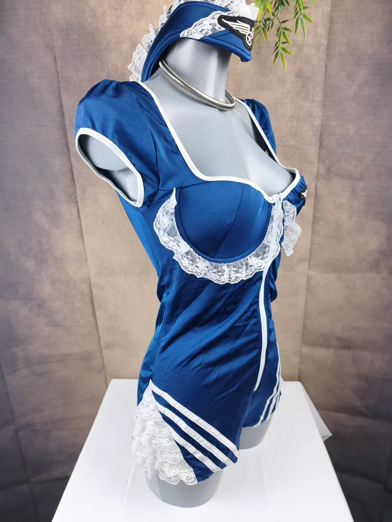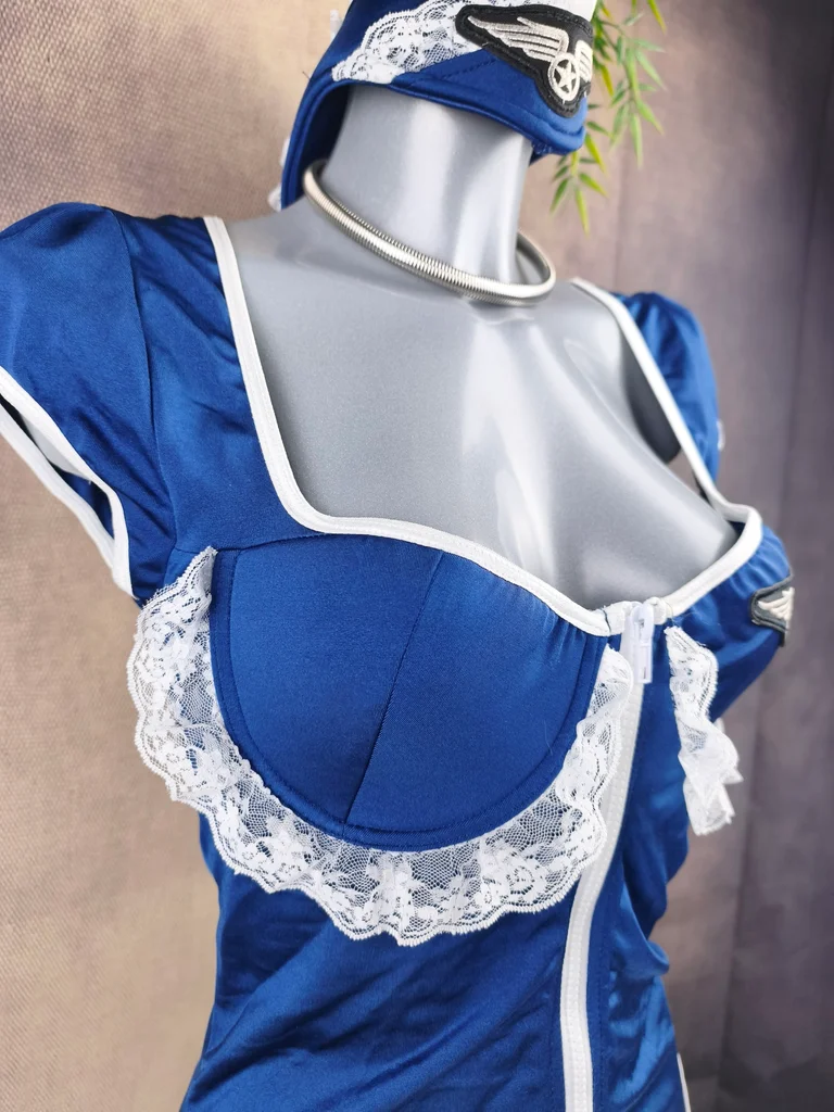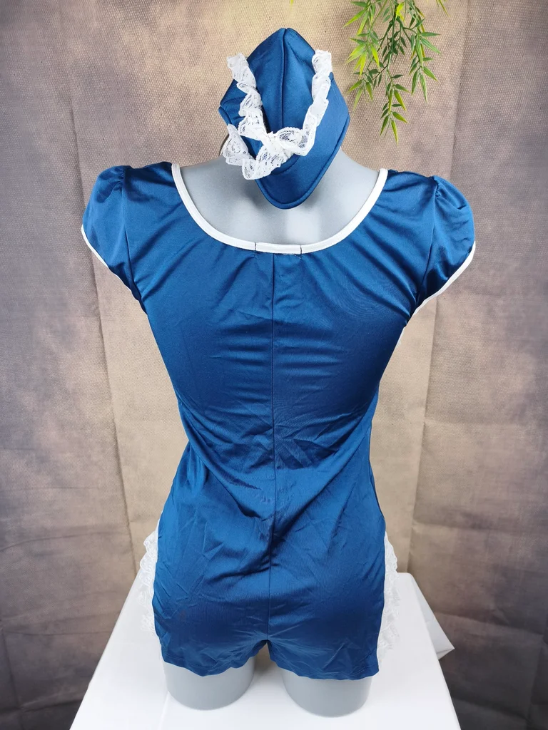 Superbe tenue costume combishort 3 pièces comprenant : - Combishort bleu satiné zippé devant. - Coiffe assortie avec détails dentelle, au look hôtesse pour une touche sexy et glamour. - Paire de mitaines blanches. Tenue originale, sexy et féminine, esprit hôtesse. Le bleu satiné apporte une touche élégante tandis que la dentelle blanche souligne le côté glamour et rétro. Peut se porter avec talons blancs ou bleus, bas résille ou collants fins pour un look complet. Taille XS/S 34-36, état impeccable comme neuf, photos conformes, vous recevez exactement l’article présenté. Envoi rapide et soigné.