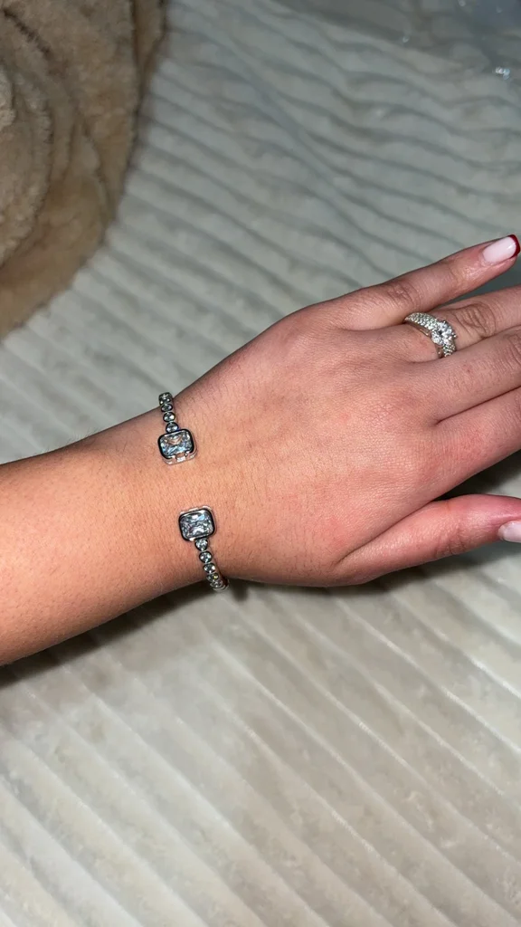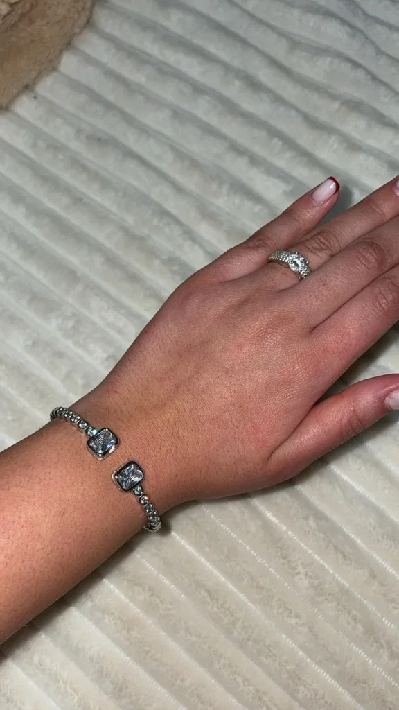 Bracelet jonc argenté ouvert très élégant et lumineux. Il se distingue par 2 cristaux centraux. Bracelet ajustable car le jonc est légèrement flexible. Parfait pour toute les morphologies Envoi ultra rapide (24h/48h) Emballage soigné