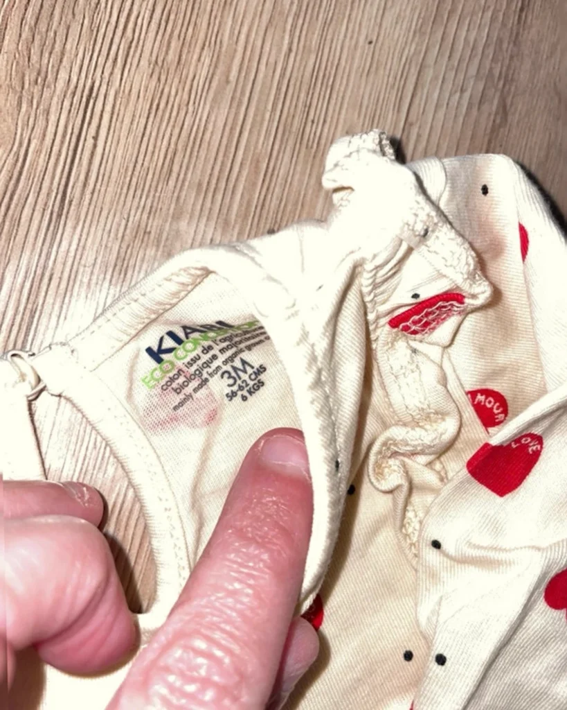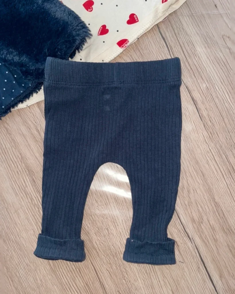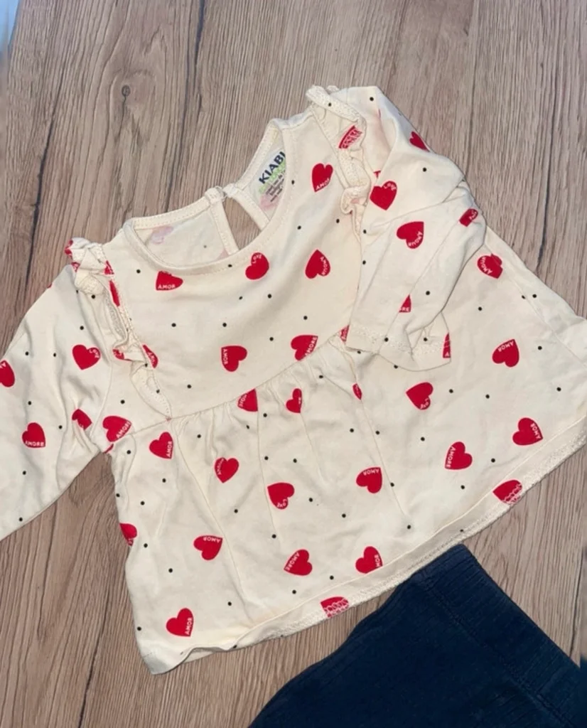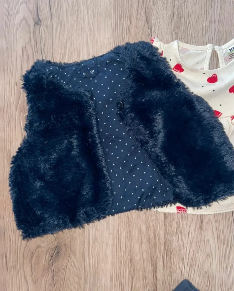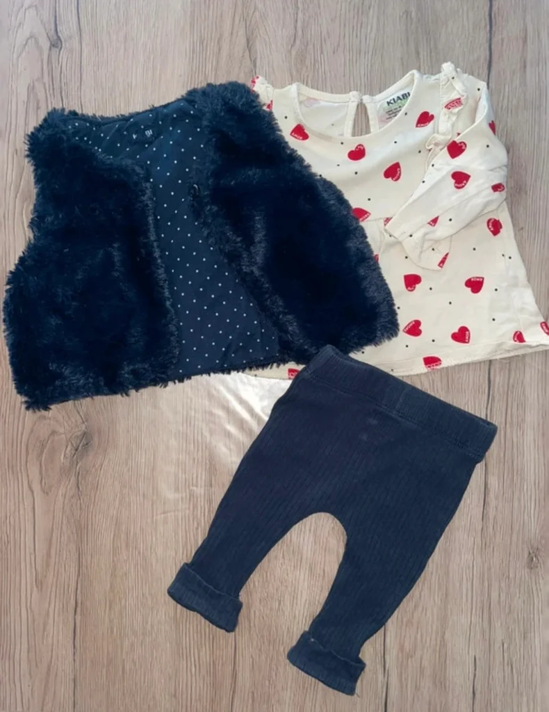 Je vends cet ensemble 3 pièces pour bébé de 3 mois / 62 cm de la marque Kiabi. - Type de produit : Ensemble 3 pièces - Taille : 3 mois / 62 cm - Marque : Kiabi - Composition : Haut crème à motifs cœurs rouges, gilet en fausse fourrure marine, legging côtelé marine N'hésitez pas à me contacter pour plus d'informations.