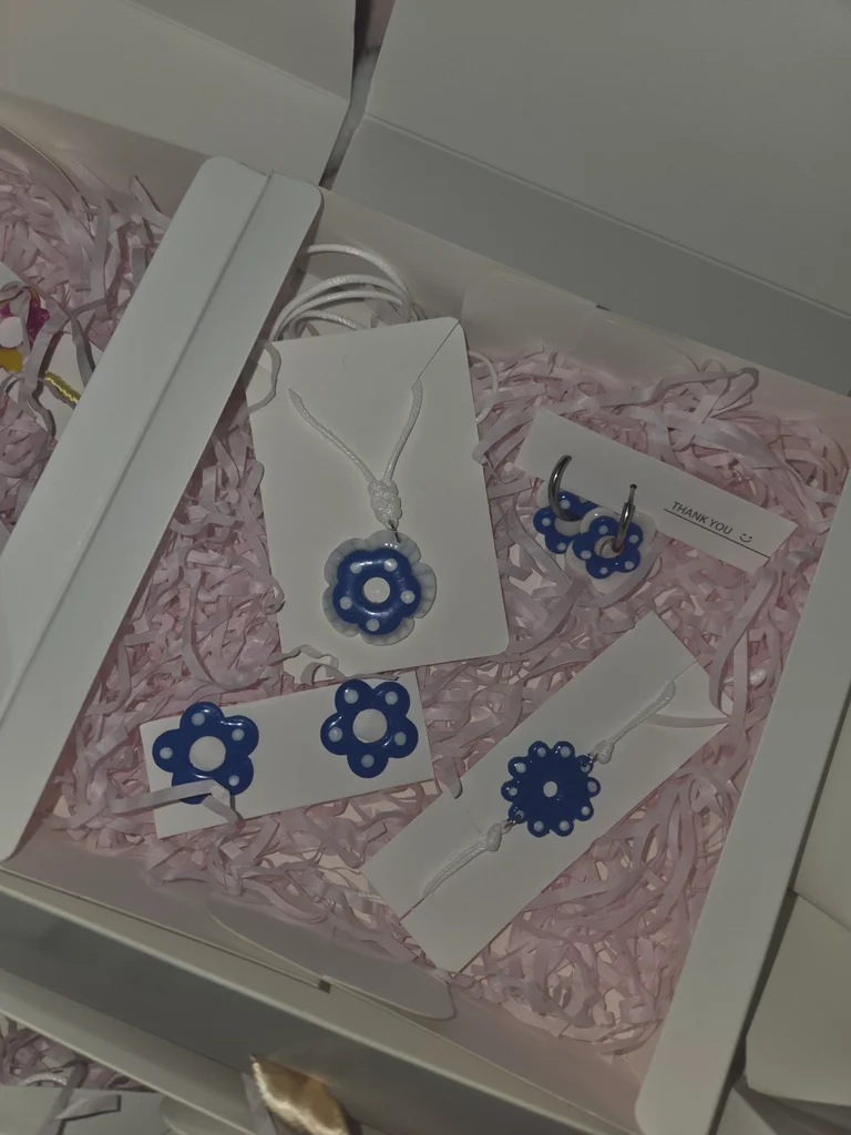 Jolie BOX ( idéal pour offrir ou s'offrir) Composé de : 1 collier ajustable 1 bracelet ajustable 1 paire de boucle d'oreille avec pampilles blanche et petite pampilles a poids bleu 1 paire de pampilles a poids bleu