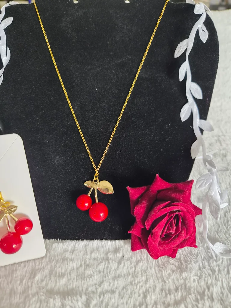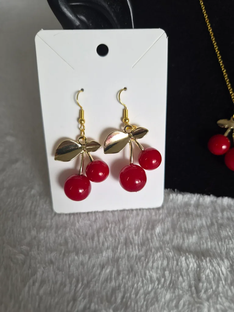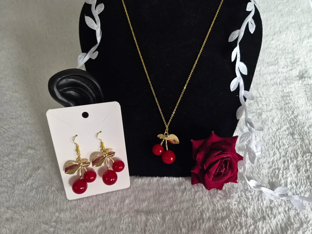 Joli ensemble de bijoux motif cerises, composé d’un collier et d’une paire de boucles d’oreilles assorties. Couleurs rouge brillant et doré, style féminin, rétro et fruité, parfait pour apporter une touche originale à une tenue. L’ensemble comprend : 1 collier avec pendentif cerises 1 paire de boucles d’oreilles pendantes assorties Couleurs : Rouge, doré Style : Fantaisie / rétro / cute Convient très bien pour un cadeau, un look d’été, une tenue romantique ou vintage. Envoi rapide et soigné.