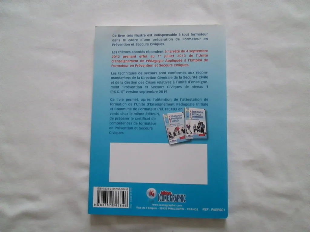 Vends livre Pédagogie Initiale et Commune de formateur. Ce livre s'adresse à toutes les personnes désireuses de faire de la formation. Il donne les bases de pédagogie, d'animation et d'évaluation pour former dans différents domaines. Sa présentation très illustrée en fait un livre attractif et compréhensible par tous. Ce livre est indispensable à tout formateur dans le cadre d'une préparation à l'unité d'enseignement de Pédagogie Initiale et Commune (P.I.C.) : - dans sa phase préparatoire en qualité d'assistant de formation ; - dans sa formation initiale ; - dans sa formation continue. Les thèmes abordés reprennent les compétences fixées par la Direction Générale de la Sécurité Civile et de la Gestion des Crises. Ce livre donne également toutes les bases de pédagogie pour enseigner quelque soit le domaine de formation. Comme neuf. N'hésitez pas à consulter mes autres annonces.