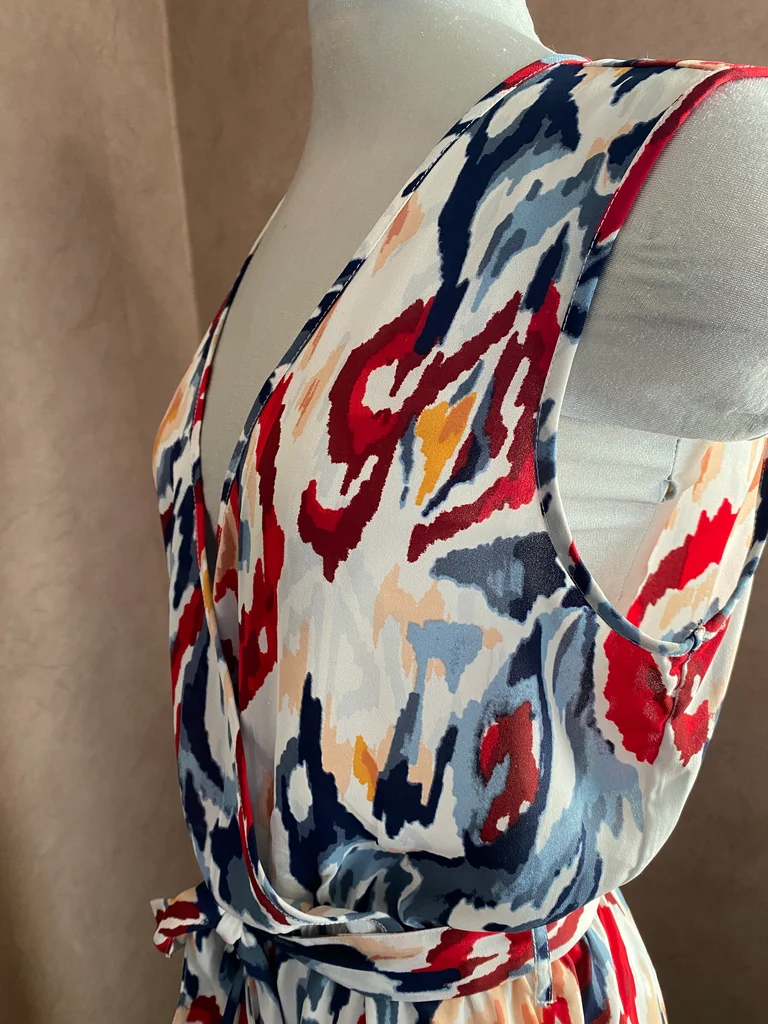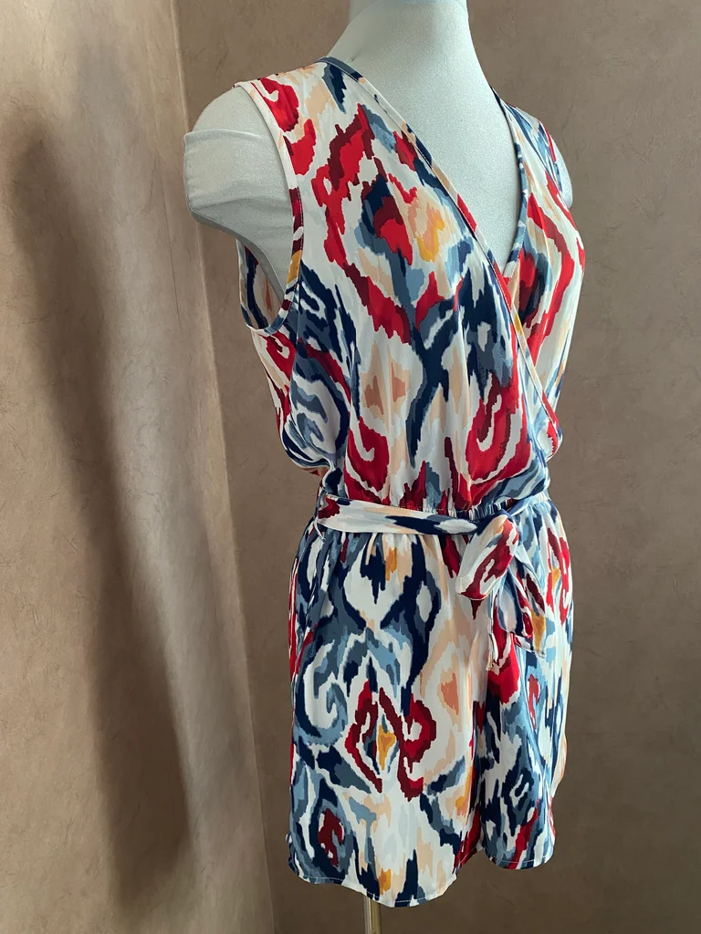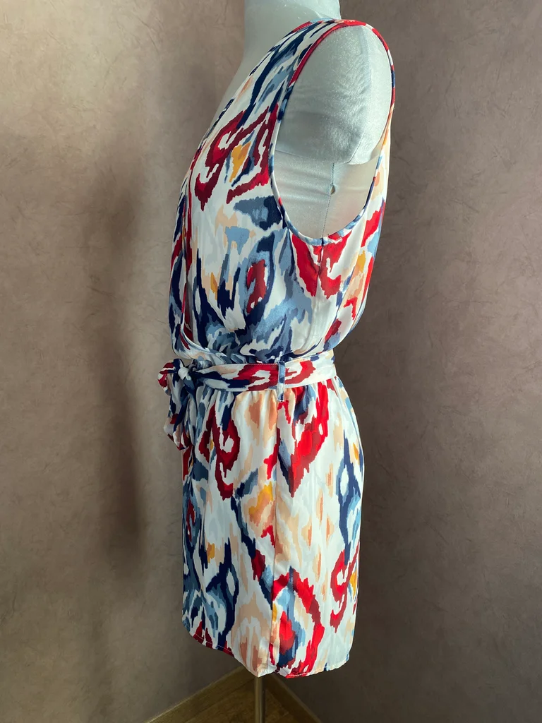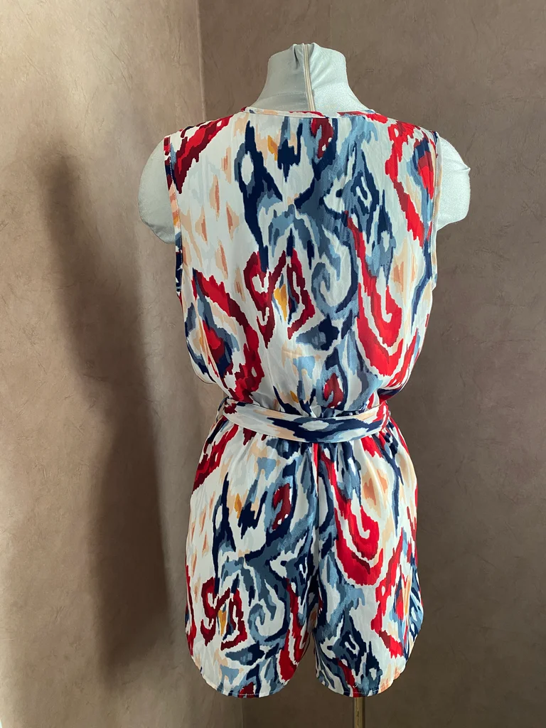 Magnifique combi short : fond blanc lumineux sublimé par un imprimé abstrait multicolore (rouge, bleu, marine, beige, touches orangées) qui apporte un style moderne, artistique et estival 🌞 Marque : ONLY En excellent état, jamais porté Taille : 36 Matière ; 100% polyester = léger, fluide et agréable à porter, avec un joli tombé Fine doublure blanche unie pour la partie short = pour plus de confort pas de transparence Le haut présente un décolleté croisé effet cache-cœur, très féminin, qui met en valeur la silhouette La taille est élastique + ceinture à nouer 🔹 Coupe fluide et flatteuse 🔹 Sans manches, idéal été 🔹 Style chic, casual ou vacances 📏 Dimensions : Largeur épaules : 36 cm Aisselle à aisselle : 47 cm Tour de taille : 33 cm (élastique) Longueur totale : 80 cm ⚡envoi rapide du colis ⚡