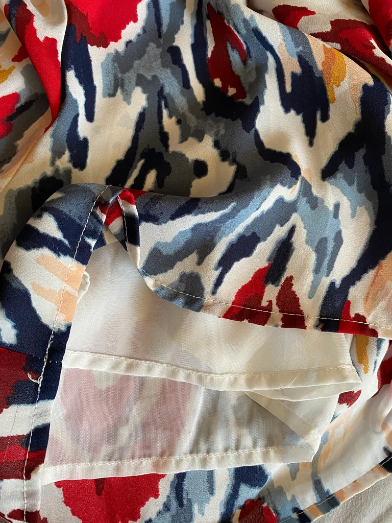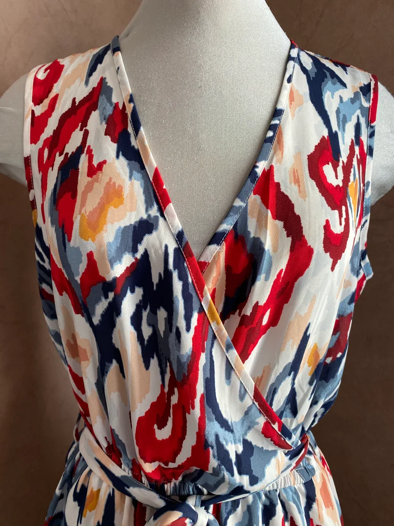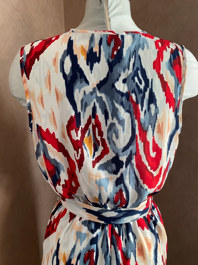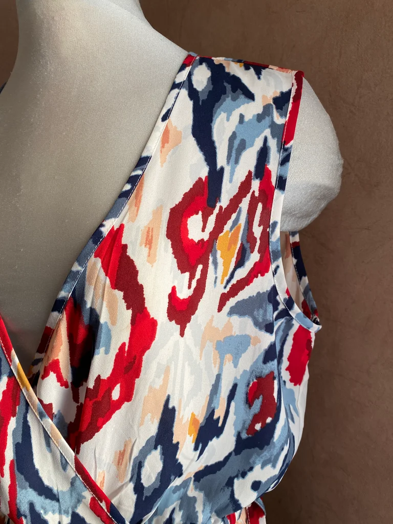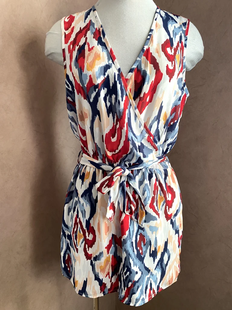 Magnifique combi short : fond blanc lumineux sublimé par un imprimé abstrait multicolore (rouge, bleu, marine, beige, touches orangées) qui apporte un style moderne, artistique et estival 🌞 Marque : ONLY En excellent état, jamais porté Taille : 36 Matière ; 100% polyester = léger, fluide et agréable à porter, avec un joli tombé Fine doublure blanche unie pour la partie short = pour plus de confort pas de transparence Le haut présente un décolleté croisé effet cache-cœur, très féminin, qui met en valeur la silhouette La taille est élastique + ceinture à nouer 🔹 Coupe fluide et flatteuse 🔹 Sans manches, idéal été 🔹 Style chic, casual ou vacances 📏 Dimensions : Largeur épaules : 36 cm Aisselle à aisselle : 47 cm Tour de taille : 33 cm (élastique) Longueur totale : 80 cm ⚡envoi rapide du colis ⚡