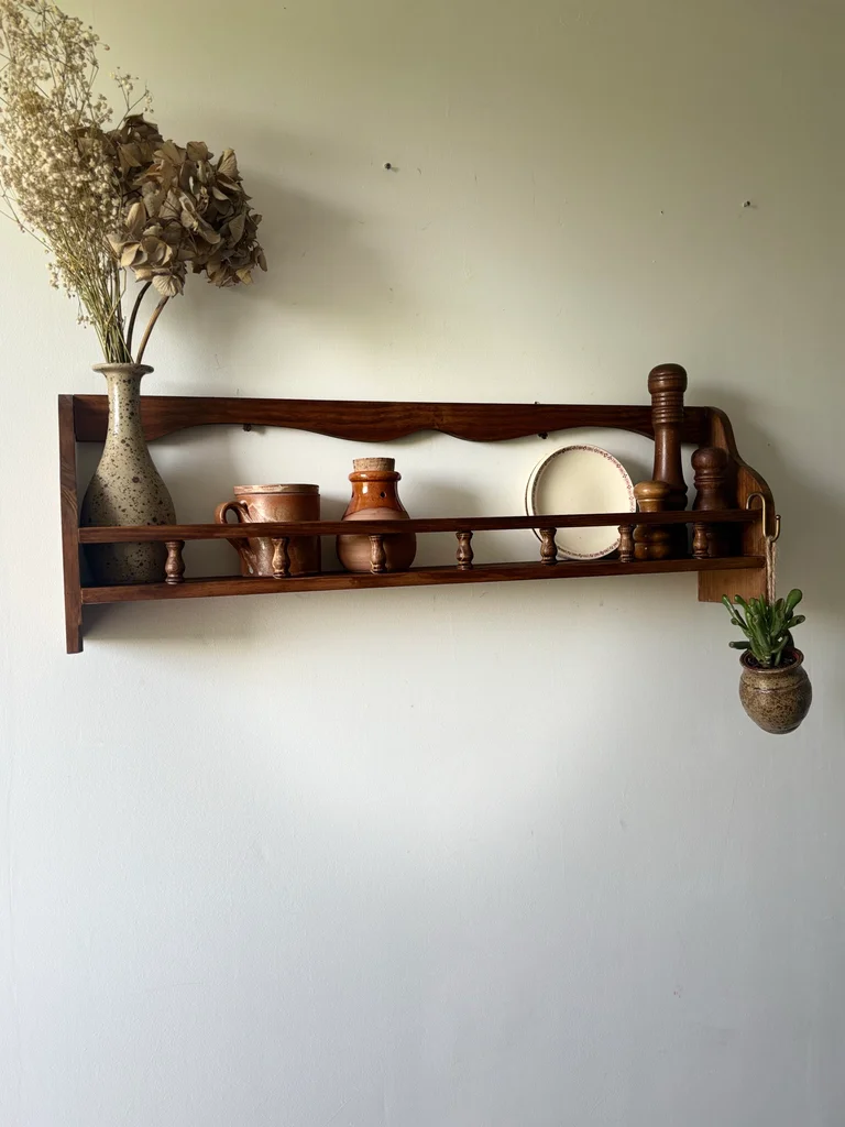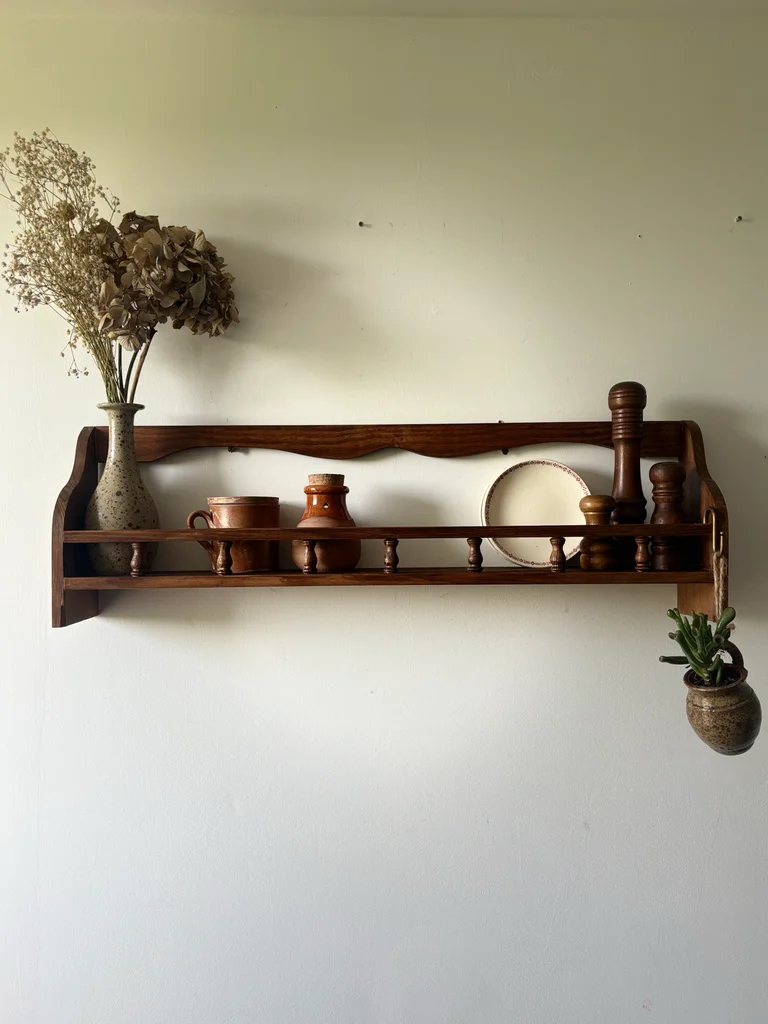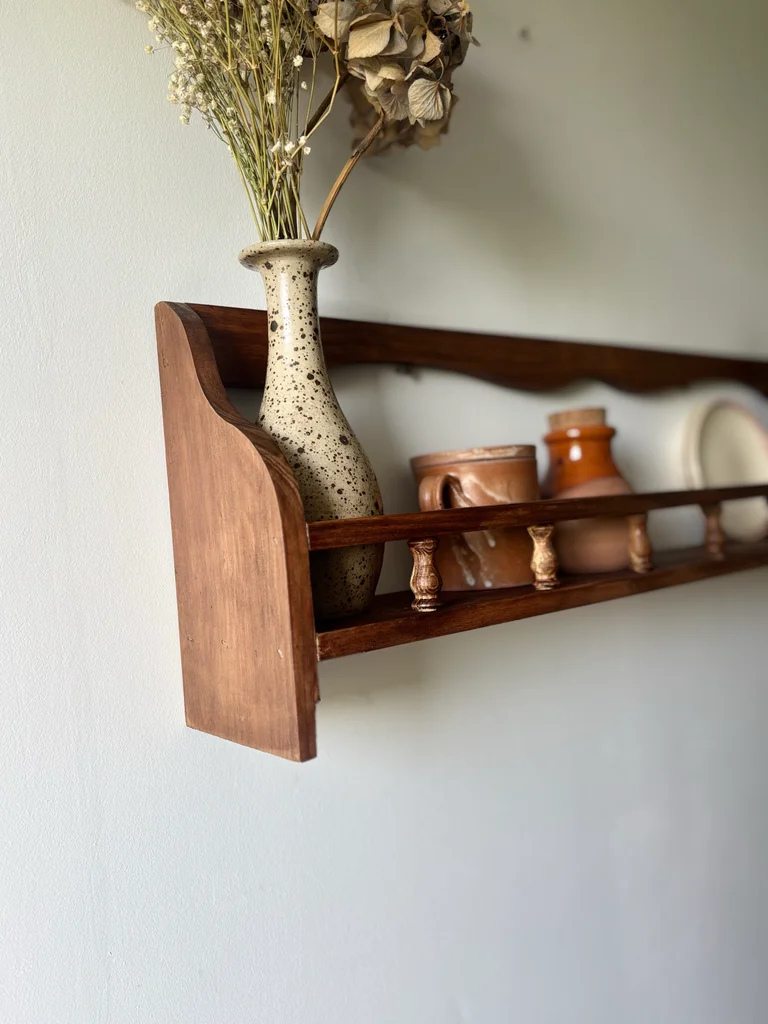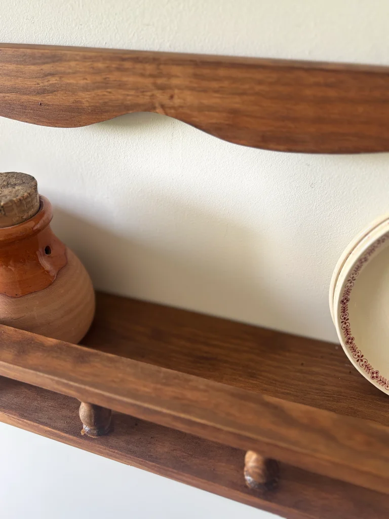 Apportez une touche authentique et chaleureuse à votre intérieur avec cette jolie étagère murale en bois. Son design simple et élégant, avec ses petites balustres, en fait une pièce idéale pour une déco cuisine, salon ou entrée f Parfaite pour exposer vos jolis objets, pots, fleurs séchées ou vaisselle ancienne * Travail important réalisé : • Entièrement poncée à la main • Peinte avec soin • Vernie pour une finition durable et protéger le bois • Peut être posée ou accrochée (système d'accroche fonctionnel) À noter : Un petit accident discret (voir photos), sans impact sur son utilisation - cela ne lui enlève rien de son charme et de son authenticité Dimensions : • Largeur : 77 cm • Hauteur : 24 cm • Profondeur : environ 12 cm Idéale pour une déco maison de campagne, bohème ou vintage