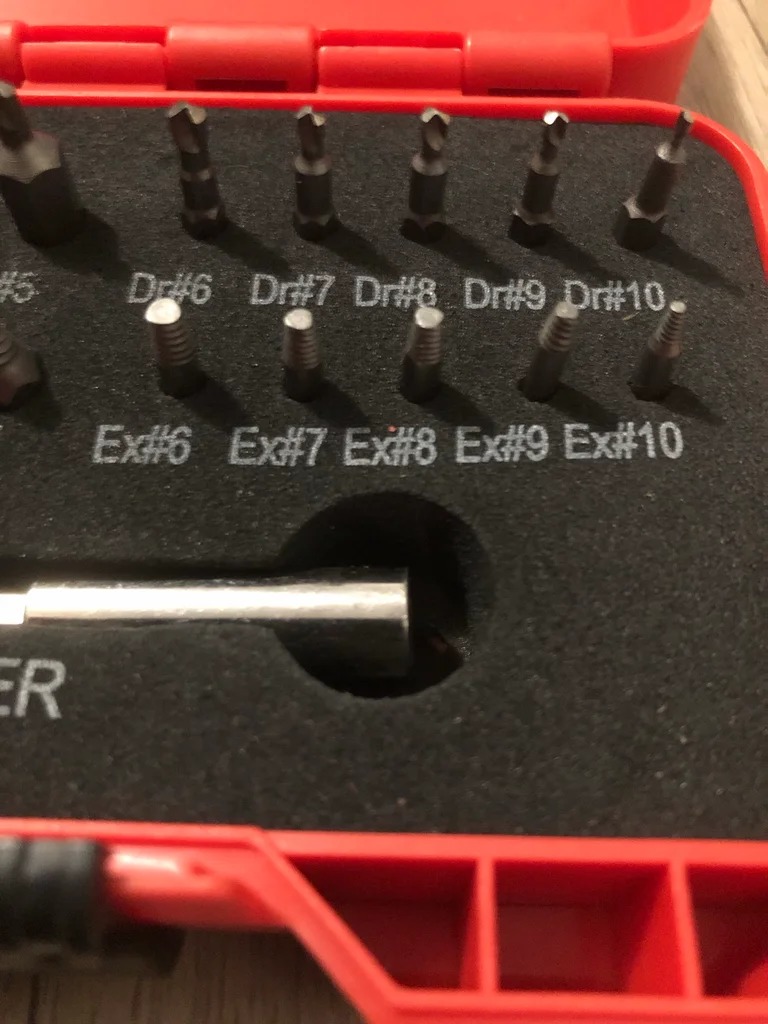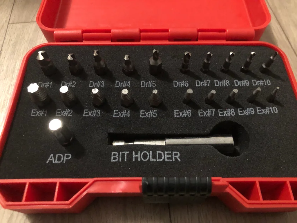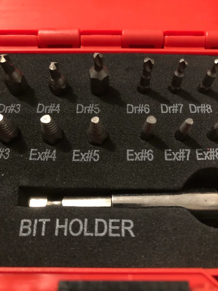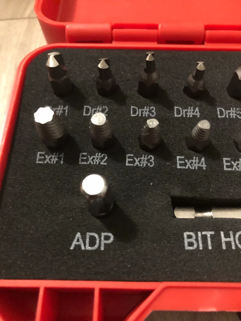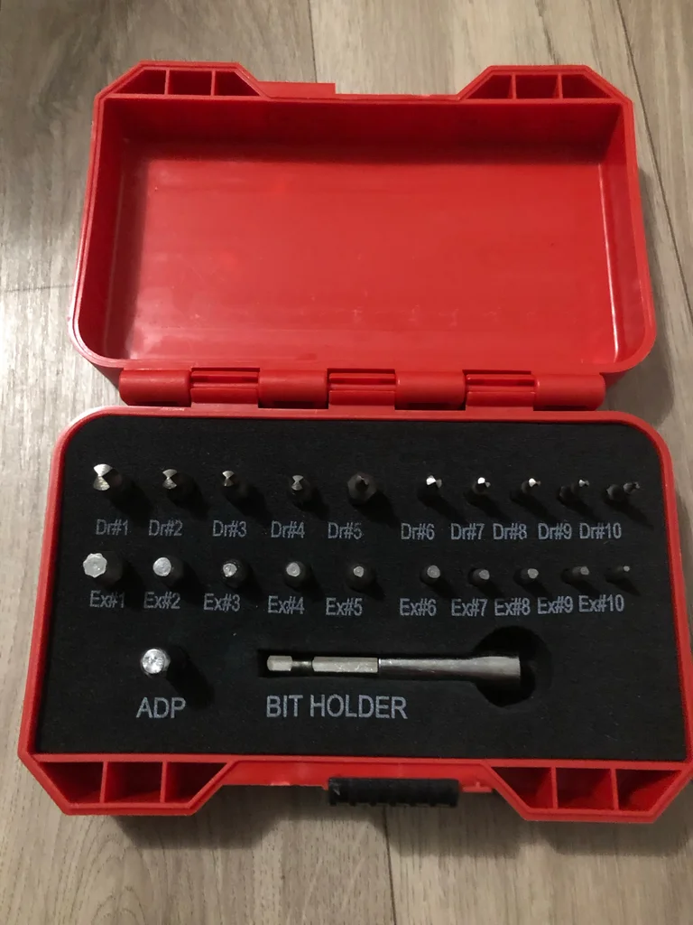 Bonjour vends un kit extracteur de vis conçu pour retirer facilement les vis et boulons endommagés. Fabriqué en acier allié de haute qualité, il est durable, réutilisable et résistant aux températures élevées. Ce kit comprend une large gamme d'outils adaptés à différents types de vis, ce qui le rend indispensable pour toute boîte à outils. Spécifications techniques Matériau : Acier allié Nombre de pièces : 22 Tailles des forets : #1 à #10 Tailles des extracteurs : #1 à #10 Inclus : 1 porte-embout d'extension, 1 adaptateur de douille Utilisation Installer les tailles #6 à #10 dans l'adaptateur de socket, puis fixer au porte-embout d'extension. Fixer directement les tailles #1 à #6 sur le porte-embout d'extension. Utiliser le foret (Dr) pour percer un trou dans la vis cassée. Changer pour utiliser le bit d'extraction (Ex) de la même taille. Inversez la perceuse pour retirer les vis cassées. Produits neufs Envoi sous 24h00