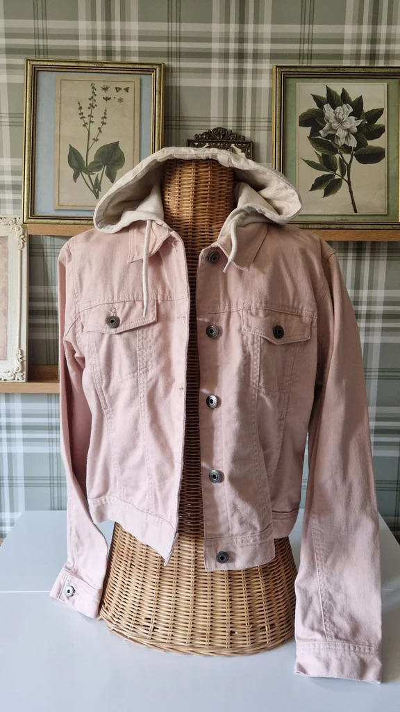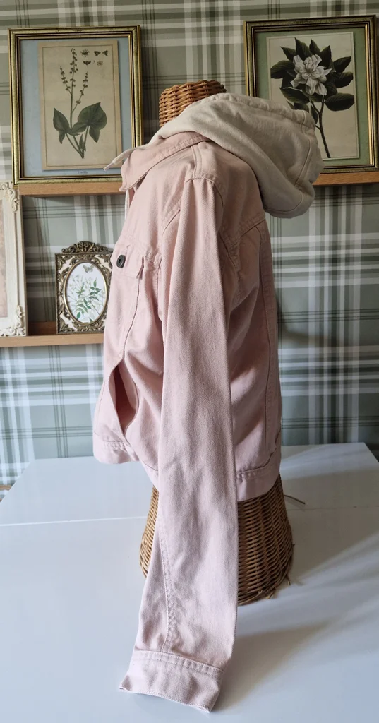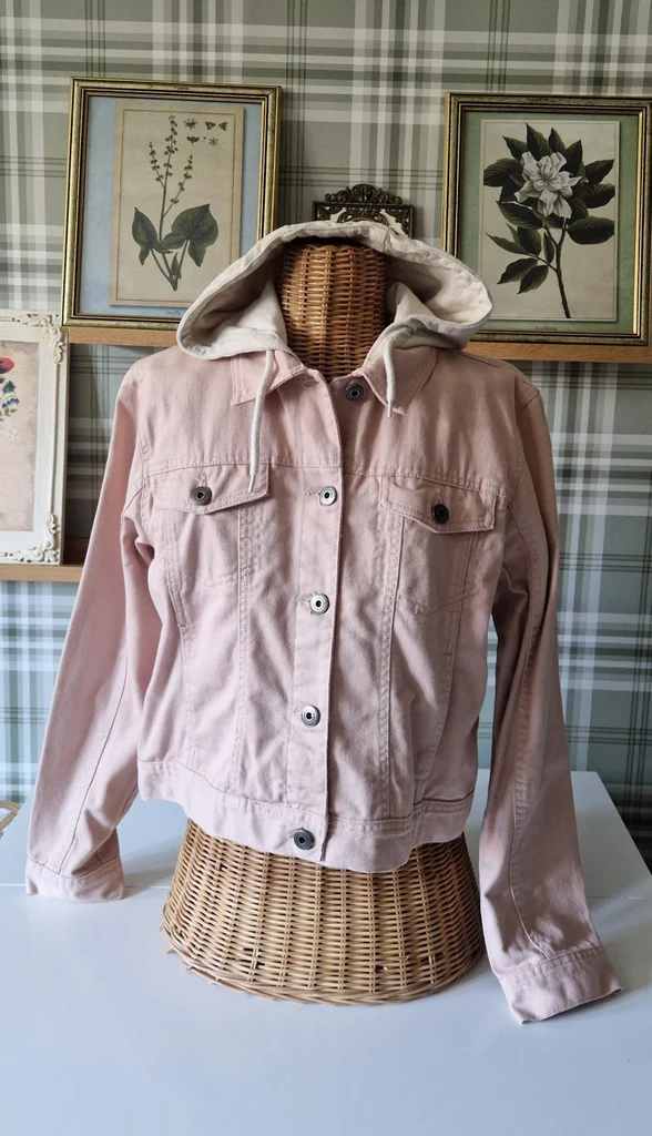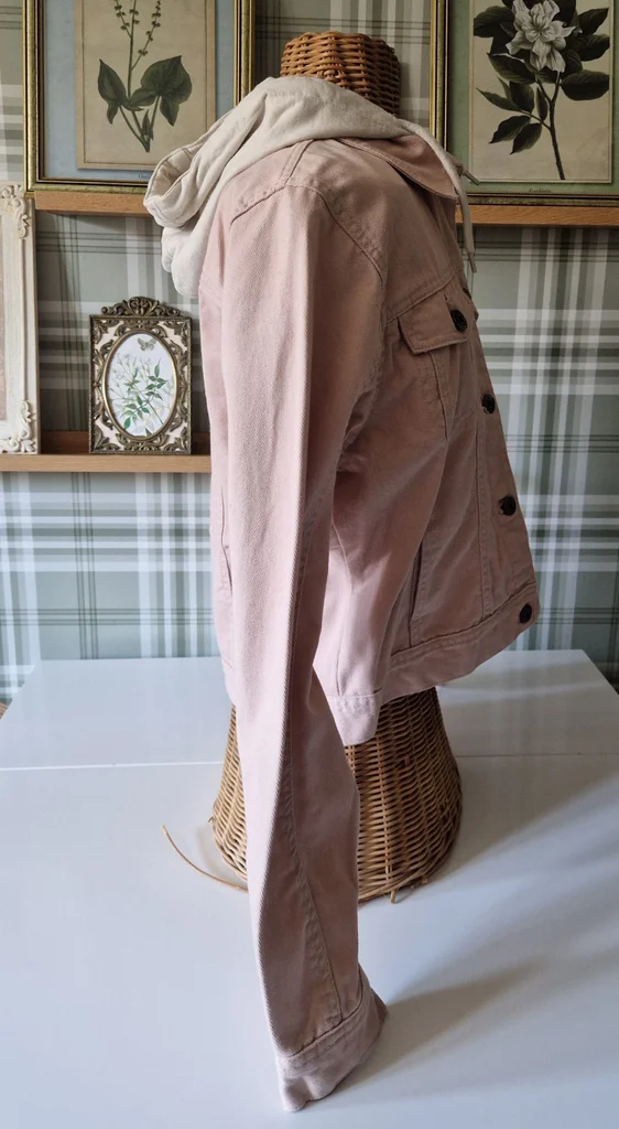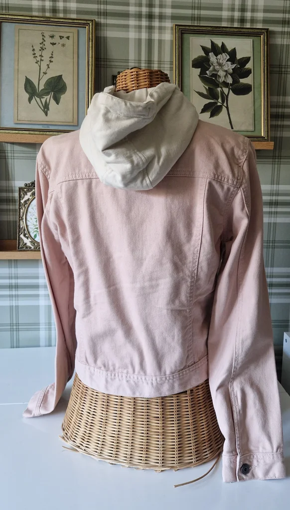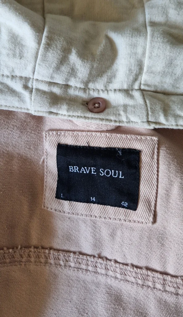 Veste avec capuche détachable. Marque : Brave Soul. Coloris : rose - rose pâle - crème - beige. Matières : Veste 100% coton - Capuche 100% coton. Taille notée : L - 14 - 42. Mesures : 49.5cm de long - 43cm aux épaules. 4 poches. Neuf sans étiquette. Jamais portée.