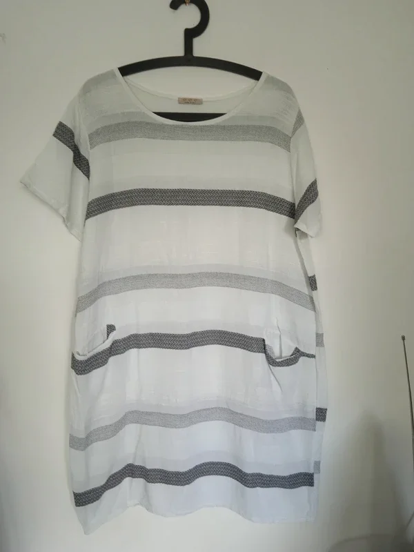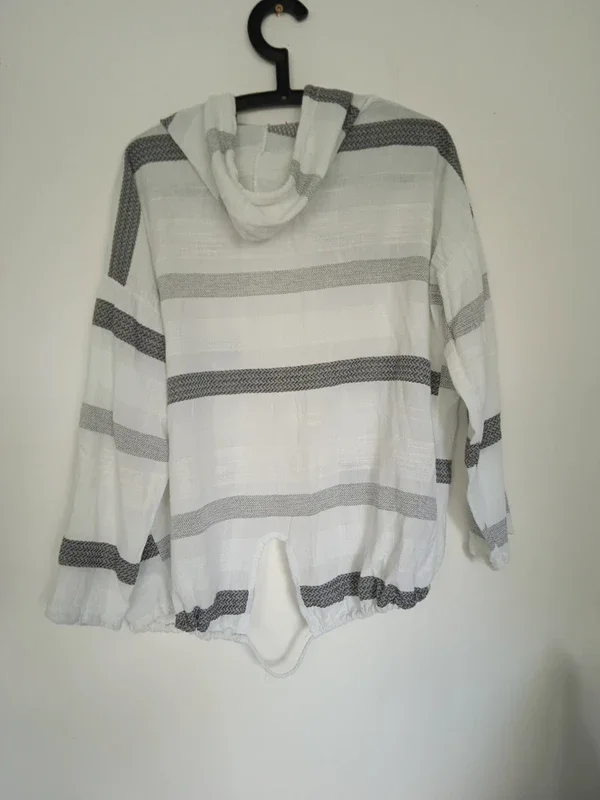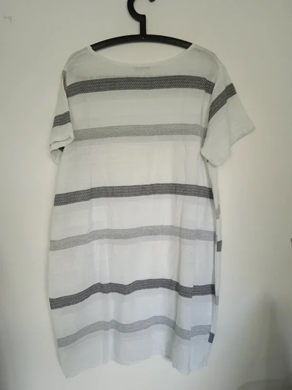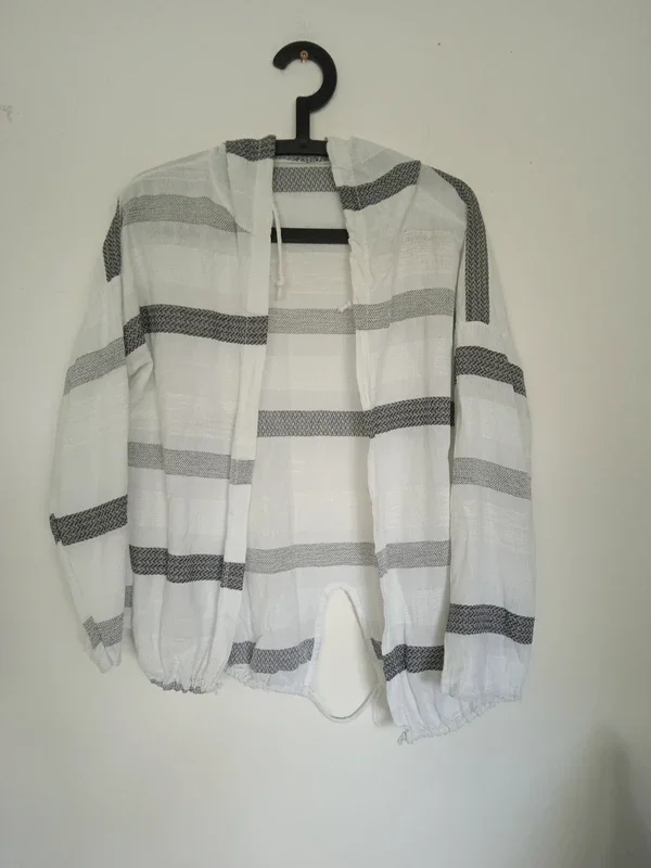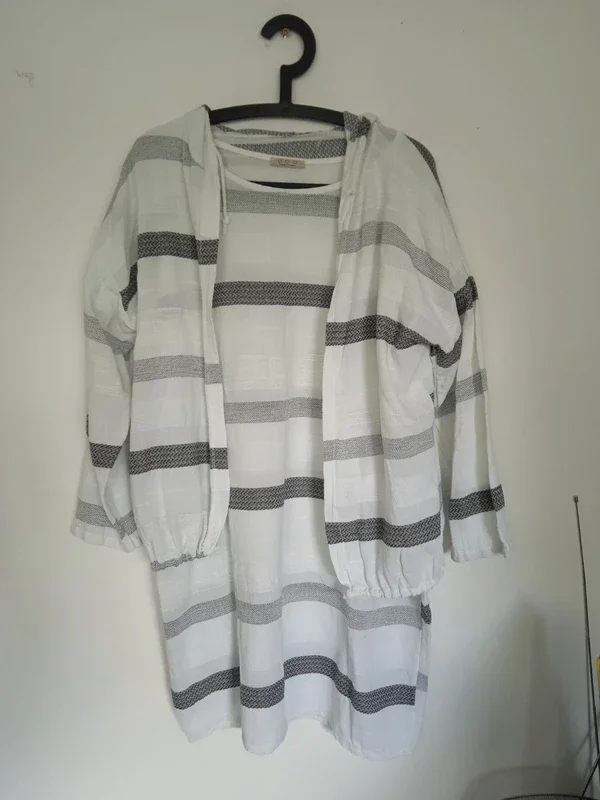 Ensemble robe et veste, léger et décontracté, casual, coton gaufrée au toucher, gaze de coton Blanc et gris a rayures robe ample et légère avec deux poches, manches courtes veste avec capuche, se porte ouverte, petit lien en bas pour ajuster très bon état il n'y a plus l'étiquette de taille mais 46/48 #ensemble #gazedecoton #ensemblecasual48 #ensemblecasual #ensembledecontracte #ensemblevacances #vesteetrobe #robe46 #robe48 #ensemble46 #ensemble48 #vesteete46 #vesteete48 #robeete46 #robeete48
