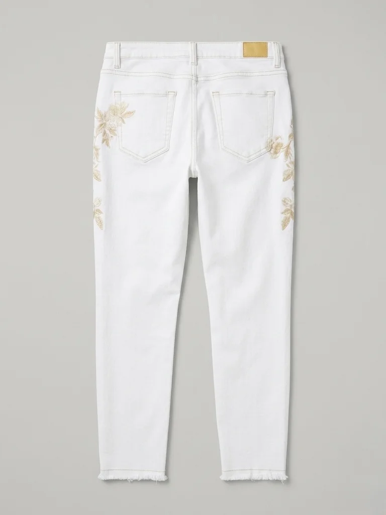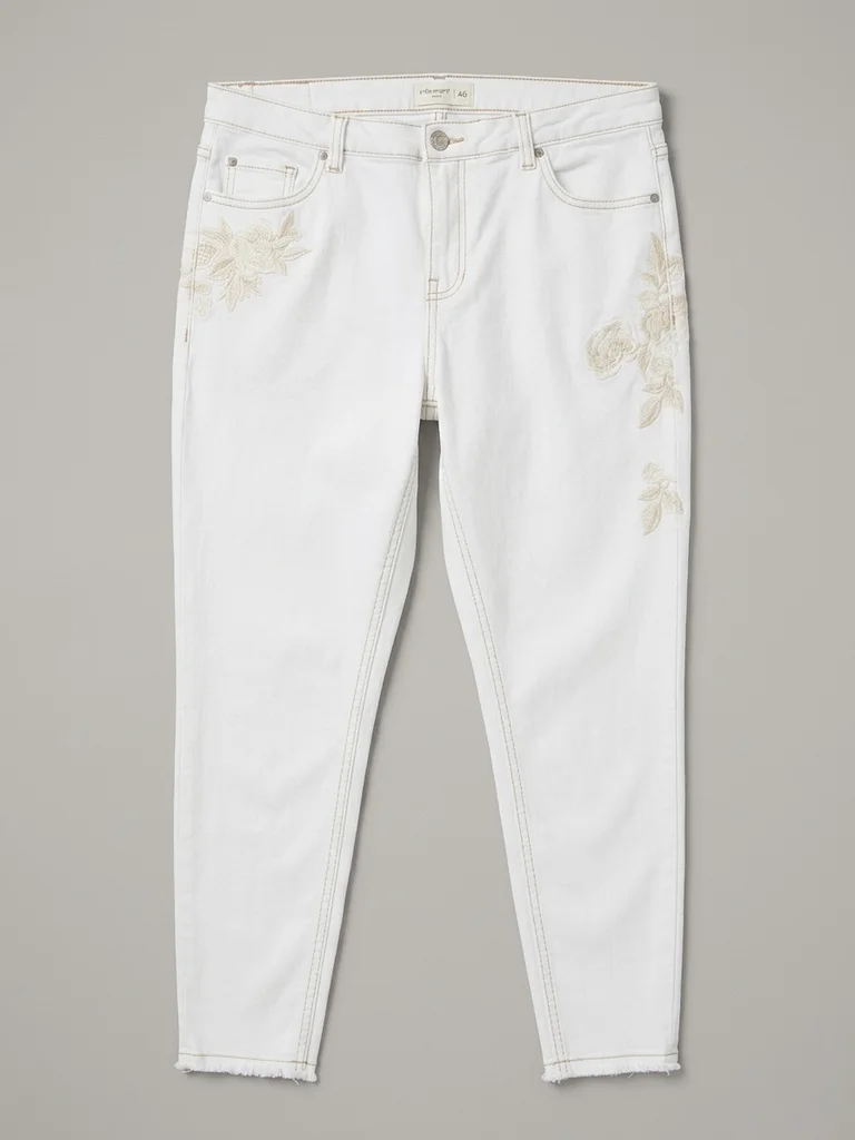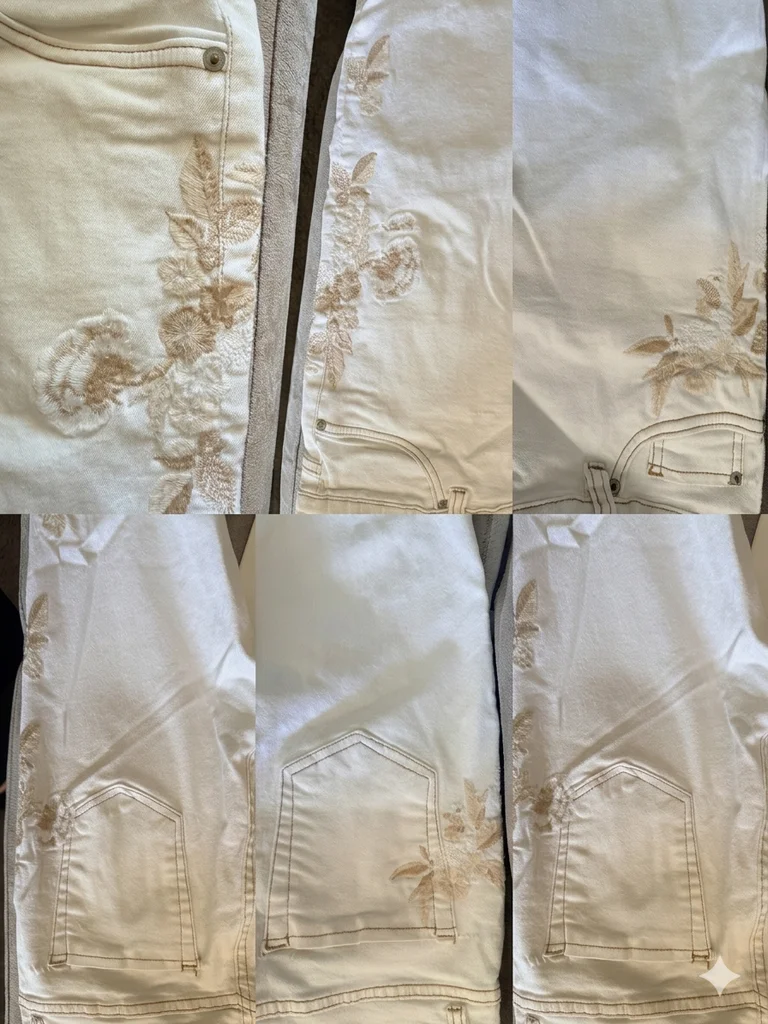 Je vends ce très joli pantalon blanc de la marque Encuentro. Il se distingue par ses magnifiques broderies florales tons sur tons (beige/crème) au niveau des poches et sur le côté de la jambe, ce qui lui donne un côté bohème et élégant. • Marque : Encuentro • Taille : 46 (FR) • Couleur : Blanc avec broderies beiges • Coupe : 7/8ème avec bas de jambe effiloché (look moderne) • Composition : 98% Coton, 2% Élasthanne (tissu confortable et légèrement extensible) • État : Bon état général Le pantalon possède 5 poches et une fermeture par bouton et zip. Idéal pour le printemps ou l'été ! #encuentro #taille46 #pantalonblanc #broderie #boho #printemps #tailleplus #curvy #jeanblanc