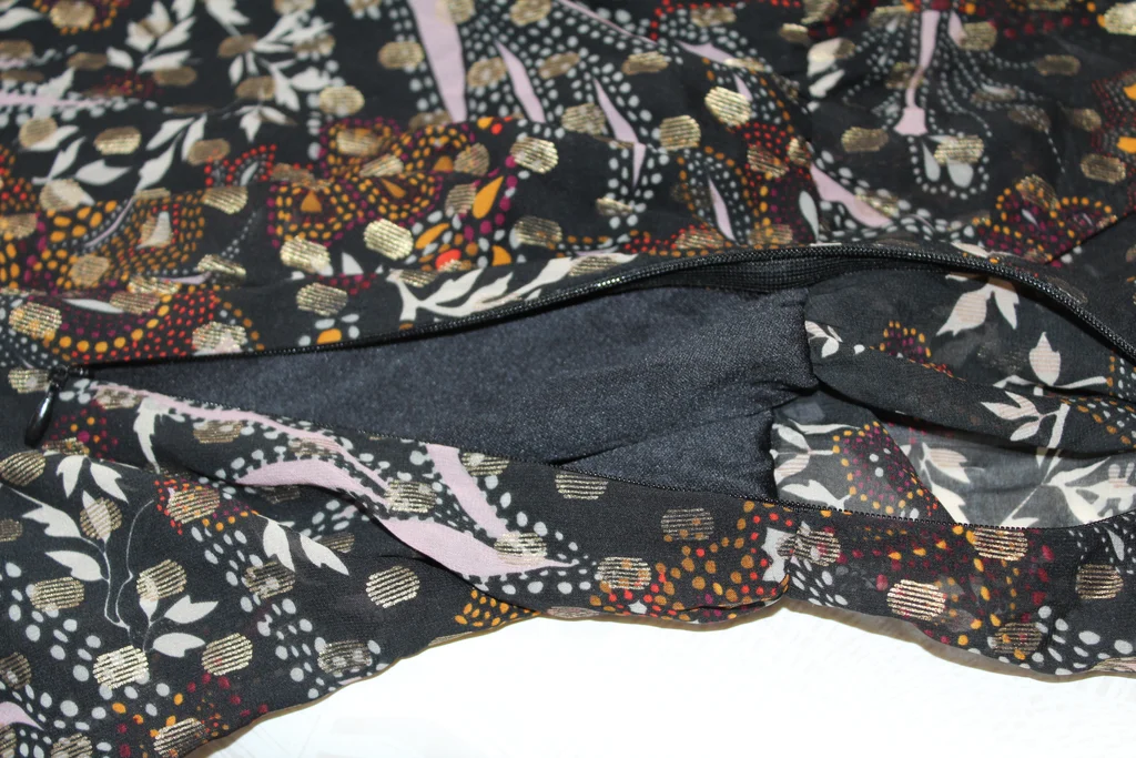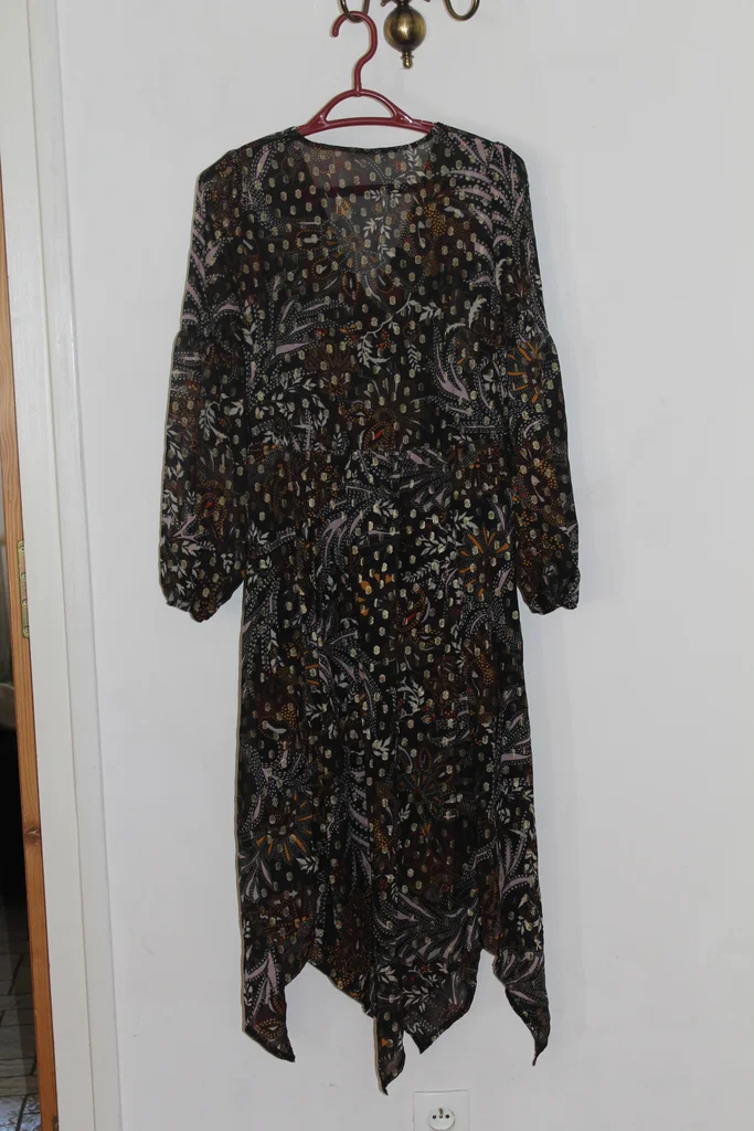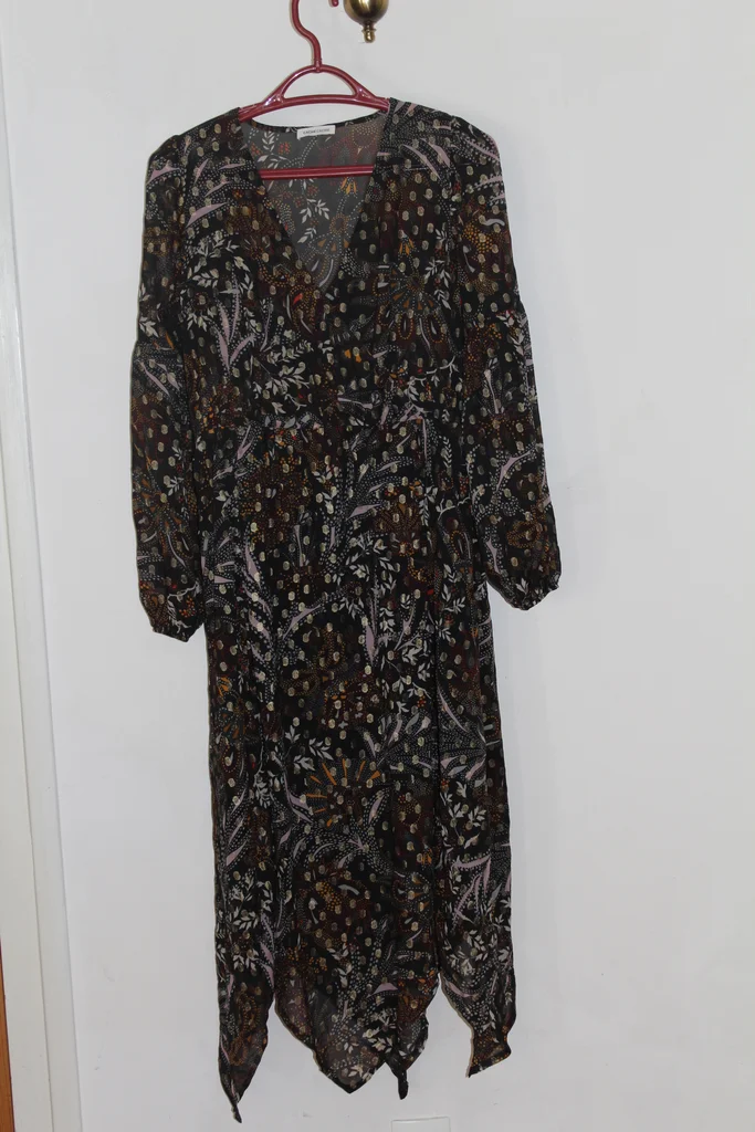 #mlaurie823vêtementsfemmetaille38 robe longue encolure en V fond noir, motifs marron et beige largeur épaules 35 cm longueur manche depuis épaule 63 cm largeur aisselle à aisselle48 cm longueur manches depuis aisselle 49 cm largeur taille 38 cm hauteur 129 cm bas fantaisi