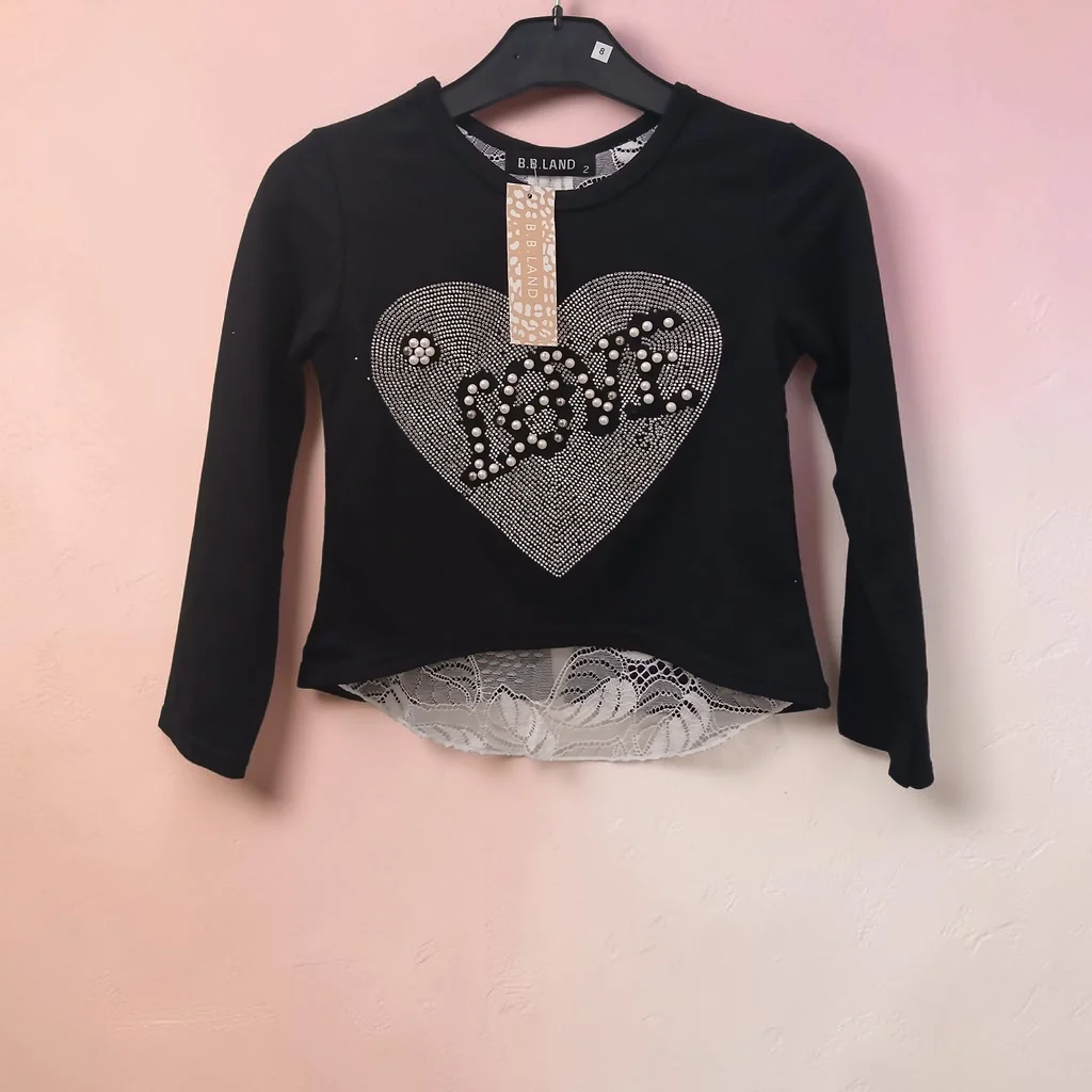 Joli t-shirt pour fille, neuf avec étiquette, taille 2 ans. Couleur noire avec un grand motif cœur décoré de strass et perles formant le mot “LOVE”. ✨ Détails : Manches longues Bas avec finition dentelle blanche élégante Matière douce et confortable (coton mélangé) Marque : B.B Land État : neuf jamais porté Parfait pour une tenue chic au quotidien ou pour une occasion spéciale 💖
