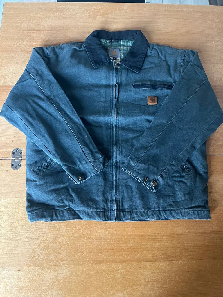Carhartt Detroit Jacket – Navy / Bleu foncé Taille : M Toile canvas duck cotton robuste Doublure flanelle tartan verte 🟩 Fermeture zip central Poche poitrine zip Poignets ajustables boutons Patch logo Carhartt cuir poitrine 🤎 Beau fading vintage naturel Bon état général ✅ Coloris navy washed très stylé 🔵 Iconic workwear américain 🇺🇸