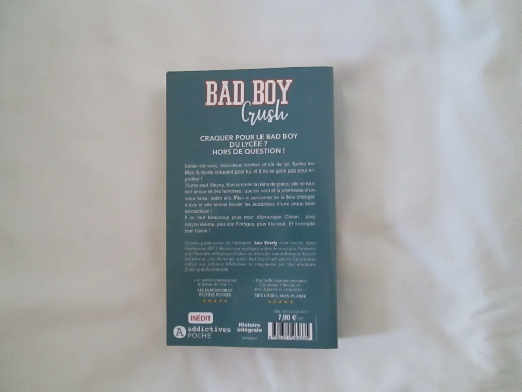 Vends livre Bad Boy Crush de Lou Everly. Neuf, jamais utilisé. CRAQUER POUR LE BAD BOY DU LYCÉE , HORS DE QUESTION ! "Célian est sexy, séducteur, sombre et sûr de lui. Toutes les filles du lycée craquent pour lui, et il ne se gêne pas pour en profiter ! Toutes sauf Alayna. Surnommée la reine de glace, elle se fout de l'amour et des hommes : que du vent et la promesse d'un cœur brisé, selon elle. Rien ne personne ne la fera changer d'avis et elle envoie bouler les audacieux d'une pique bien sarcastique ! Il en faut beaucoup plus pour décourager Célian : plus Alayna résiste, plus elle l'intrique, plus il la veut. Et il compte bien l'avoir !" N'hésitez pas à consulter mes autres annonces.