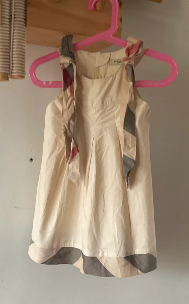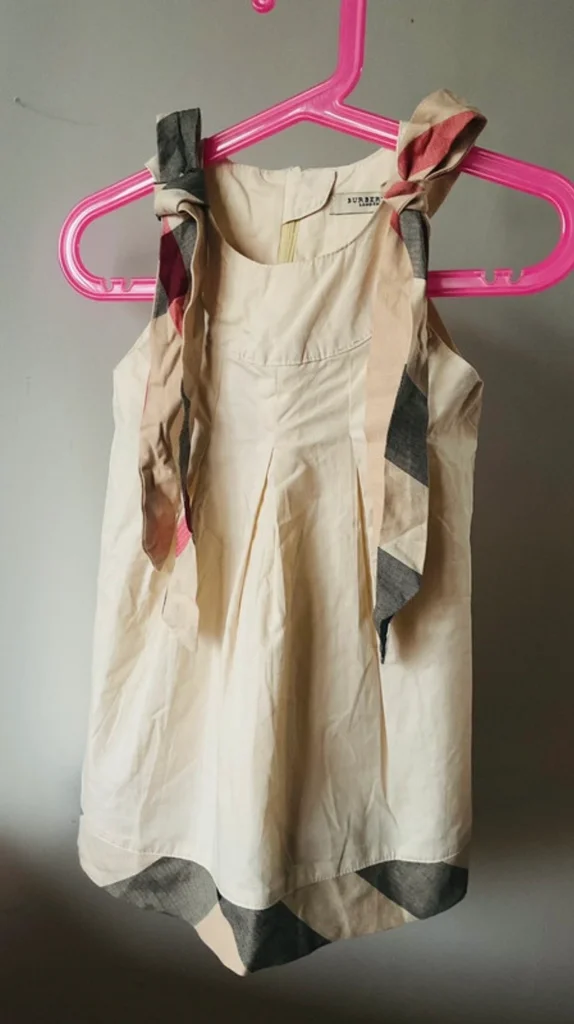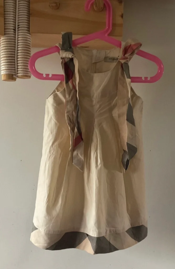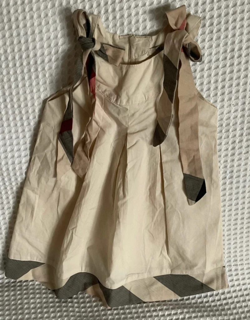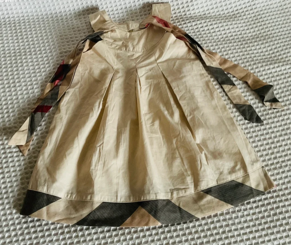 Magnifique robe Burberry London originale pour petite fille. Un classique indémodable de la marque avec son coloris beige et ses détails en check (carreaux). Coupe trapèze avec plis élégants sur le devant. Épaules : Bretelles à nouer soi-même en tissu tartan assorti au bas de la robe, vous pouvez ajuster la longueur et former de jolis nœuds selon votre préférence Zip élégant et invisible au dos. 100% Coton de haute qualité, très doux. Taille L correspond à de 3 ou 4 ans selon, L 50cm et 28,5 cm d’aisselles. En excellent état, très peu porté. Idéale pour une cérémonie, un baptême ou pour un look chic au quotidien. Envoi rapide 📦