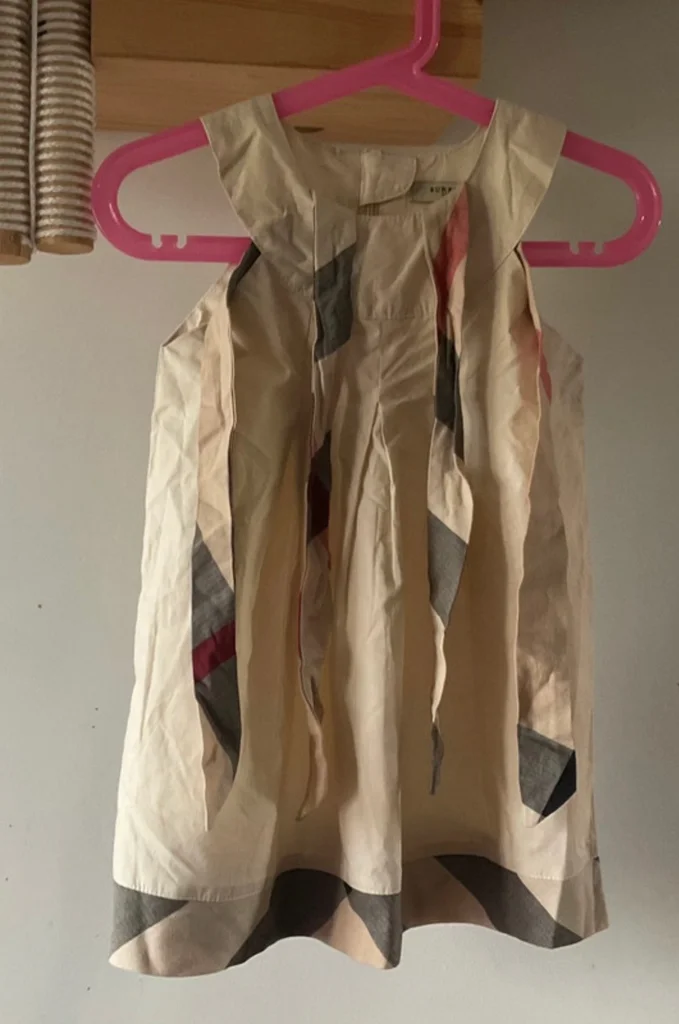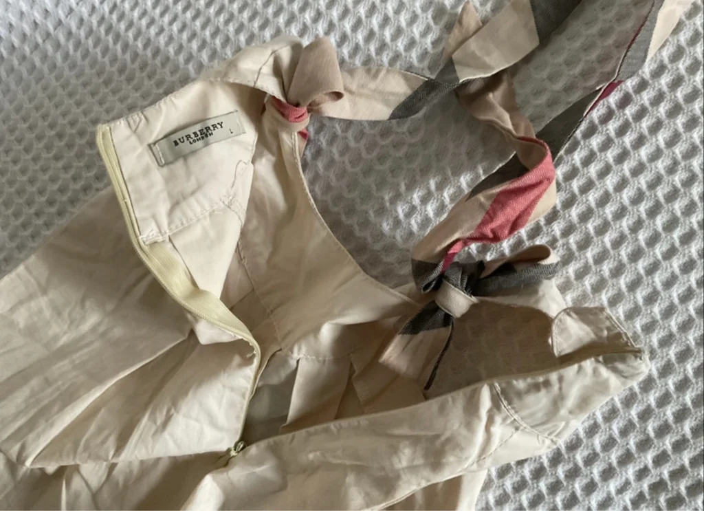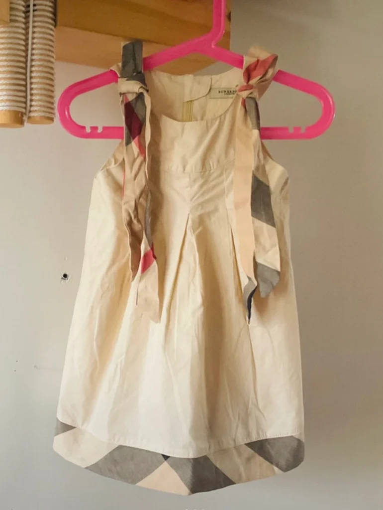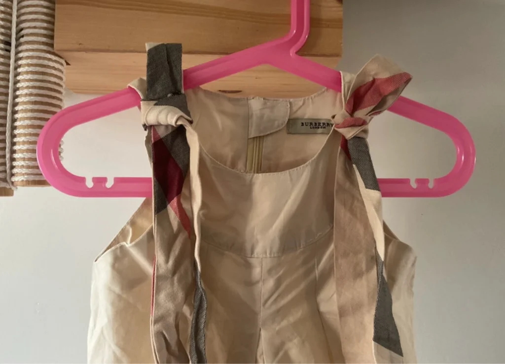 Magnifique robe Burberry London originale pour petite fille. Un classique indémodable de la marque avec son coloris beige et ses détails en check (carreaux). Coupe trapèze avec plis élégants sur le devant. Épaules : Bretelles à nouer soi-même en tissu tartan assorti au bas de la robe, vous pouvez ajuster la longueur et former de jolis nœuds selon votre préférence Zip élégant et invisible au dos. 100% Coton de haute qualité, très doux. Taille L correspond à de 3 ou 4 ans selon, L 50cm et 28,5 cm d’aisselles. En excellent état, très peu porté. Idéale pour une cérémonie, un baptême ou pour un look chic au quotidien. Envoi rapide 📦