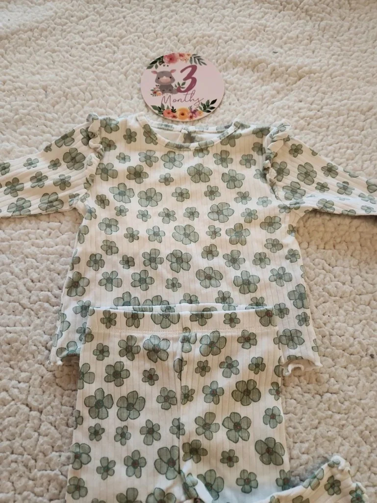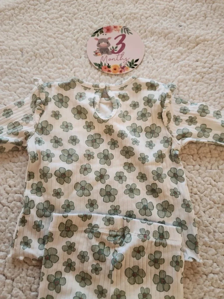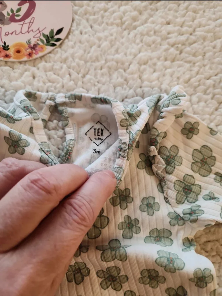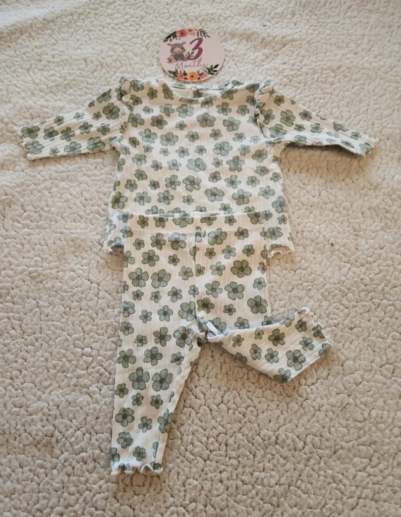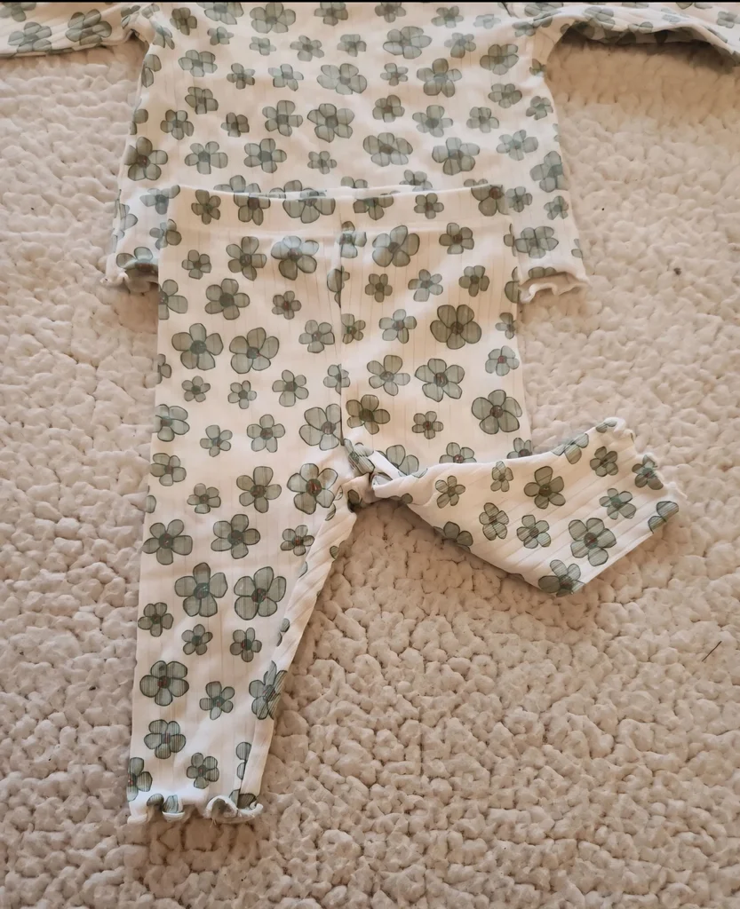 Petit look parfait pour les photos ! Ensemble floral dans les tons verts et neutres Texturé côtelé et petits volants qui font la différence