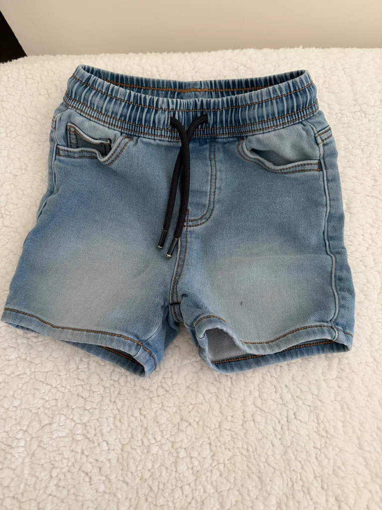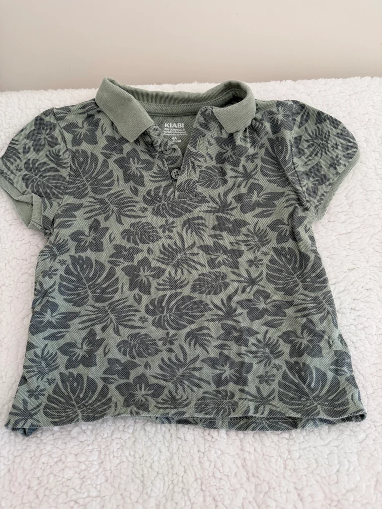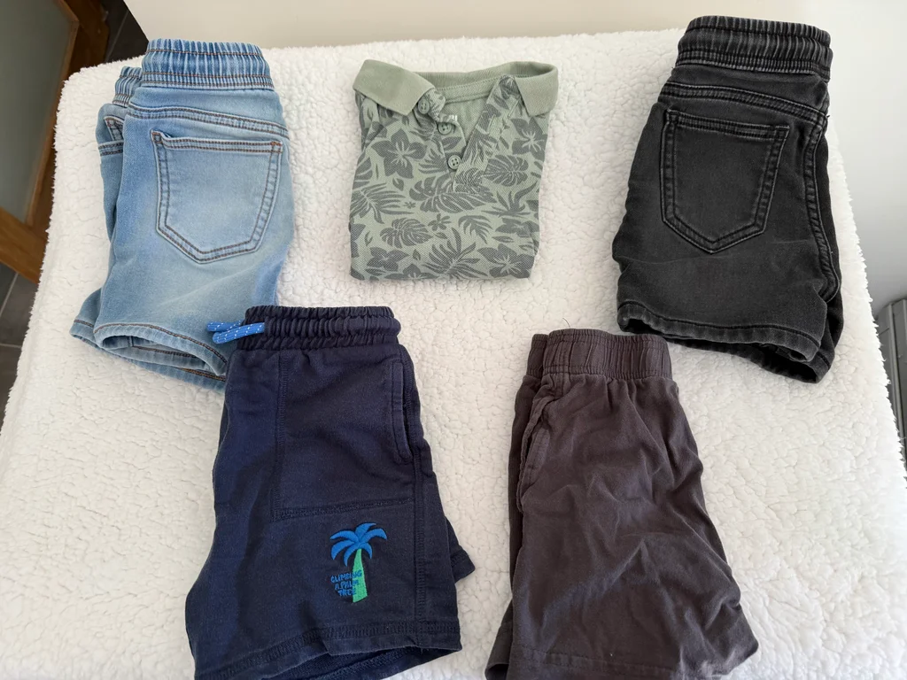 Lot vêtements été garçon 4 ans marque Kiabi 2 shorts en jeans un bleu clair , un noir 1 short souple noir 1 short palmier 🌴 bleu marine 1 polo feuilles/fleurs Le tout est en parfait état