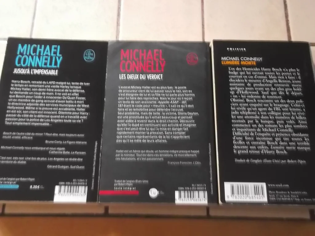 Bonjour, Vends : Livres Michael Connelly : -Jusqu'à l'impensable -Les dieux du verdict -Lumière morte 2€ le livre