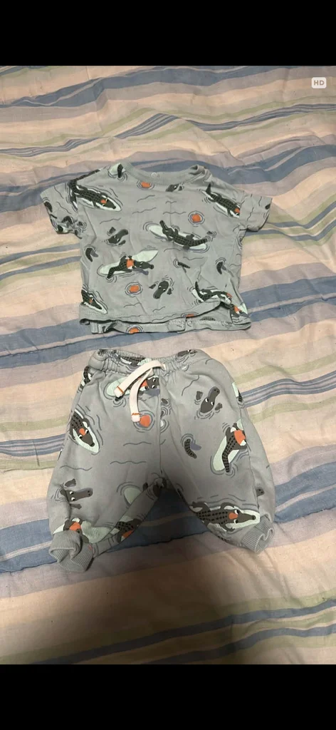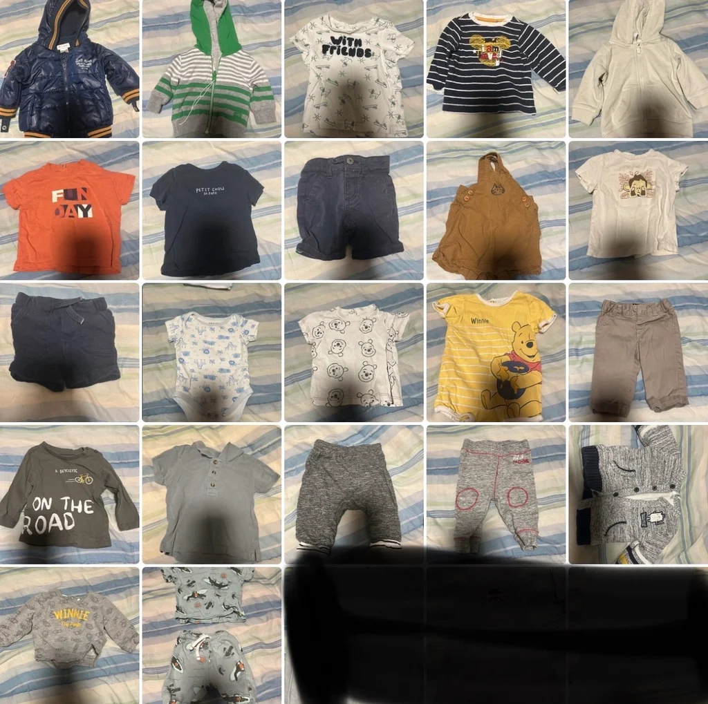 22 articles Trois. Vestes. Deux . Combi short. Un ensemble Un manteau 7 t shirt 1 pull 1 t shirt longue manche 2 short 3 pantalon Un. Bodies avec, bonnet.