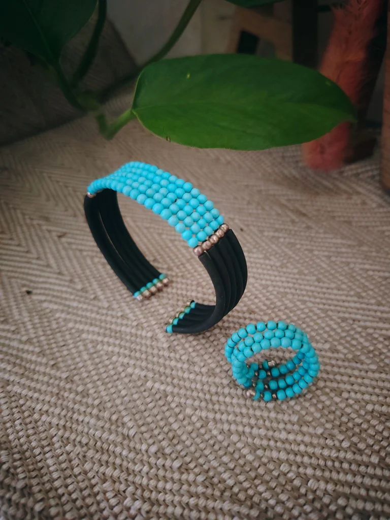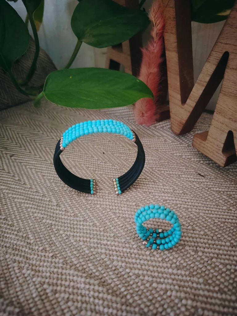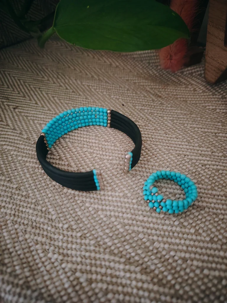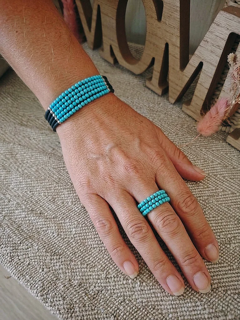 Ensemble de bijoux fantaisie, qui comporte un bracelet manchette en perles turquoise et noir avec sa bague en perles turquoise qui s'adapte à tous types de doigts
