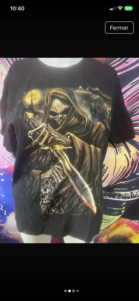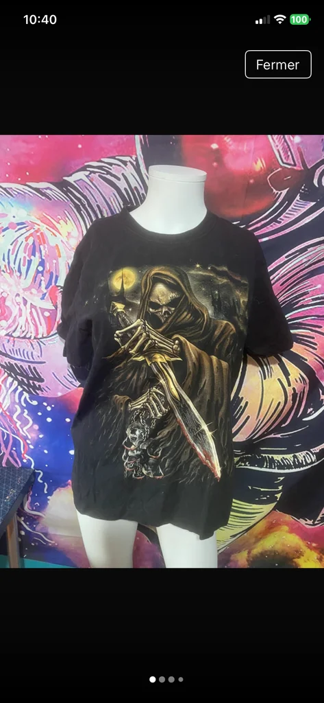 T-shirt noir taille M avec imprimé style gothique / dark représentant une tête de mort avec une épée ⚔️ Pièce originale qui donne un vrai style rock / alternatif, parfaite pour un look affirmé. ✔️ Bon état ✔️ Coupe confortable ✔️ Imprimé visuel et tendance À porter avec jean, cuir ou look streetwear pour un effet stylé assuré 😎 N’hésitez pas à me contacter pour plus d’infos !