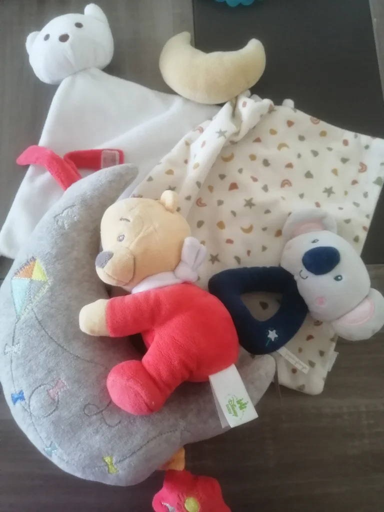 Lots de naissance éveil bébé Berceuse musical Winnie l'ourson Hochey gipsy Et 2 doudou (Le jaune à des traces de feutre) Sinon en parfait état