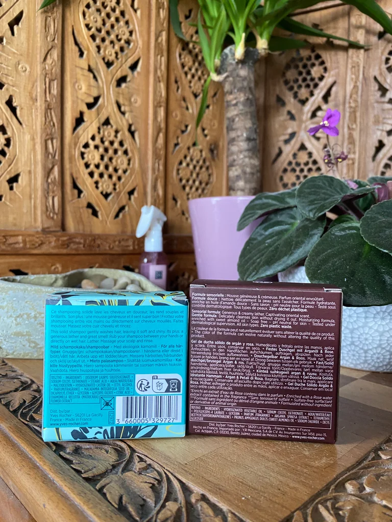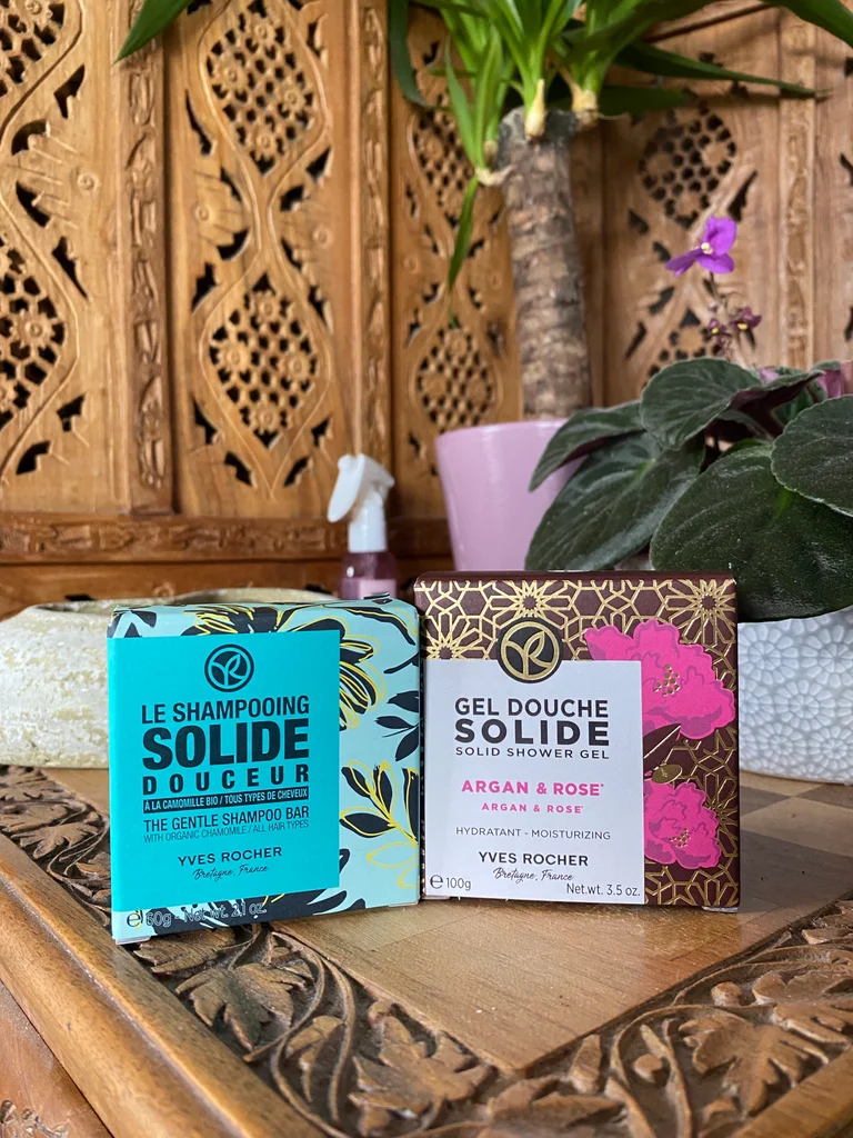 Lot Yves rocher avec: - 1 shampooing solide douceur tous types de cheveux exp 11/2027 - 1 gel douche solide argan et rose hydratant Exp 01/2028 Neufs et jamais ouverts