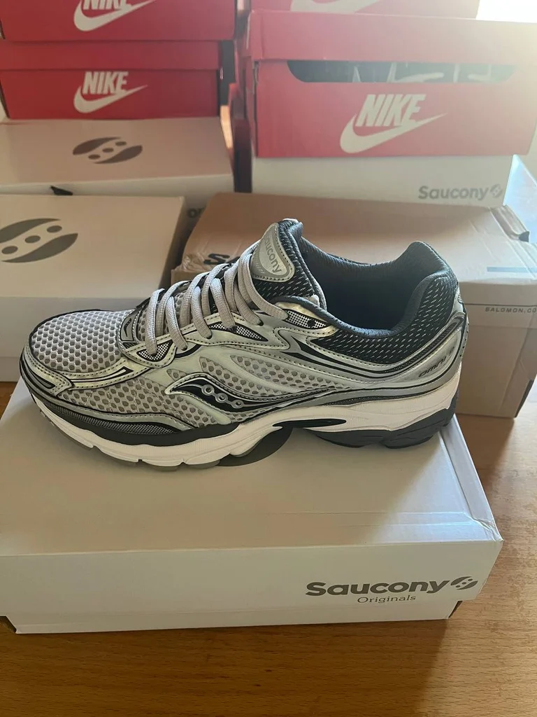 Saucony Progrid Omni 9 – Silver / Black / White Pointure : 43.5 Tige mesh gris argenté Overlays synthétiques noirs & argentés Contours noirs signature Omni 9 Logo Saucony argenté Semelle blanche & noire chunky Boîte Saucony Originals 📦 NEUF avec boîte ✅ Coloris silver/black ultra stylé 🖤🤍 Modèle très tendance 🔥