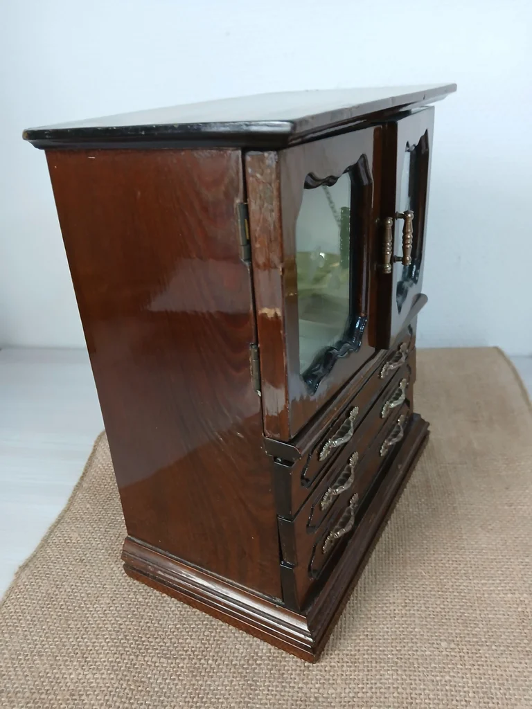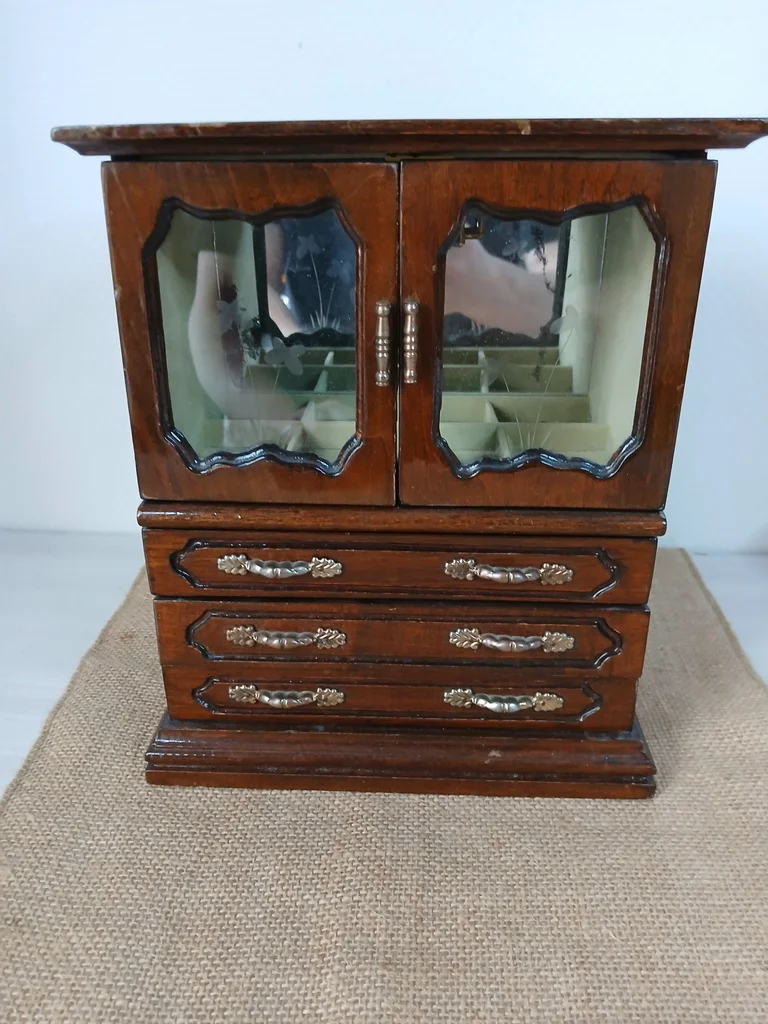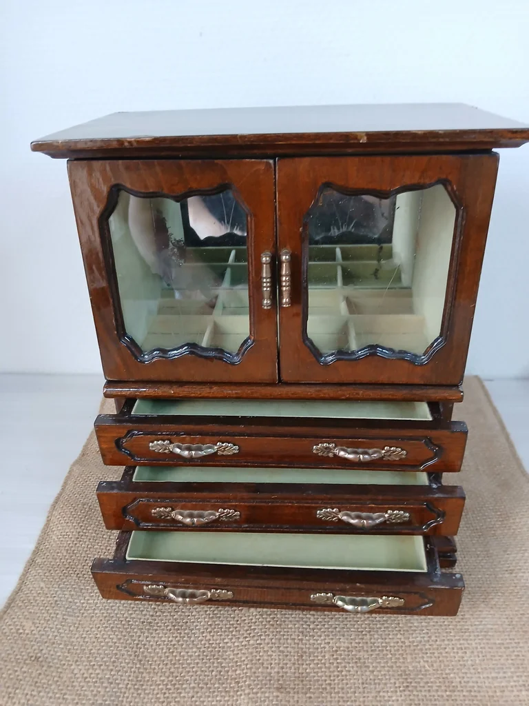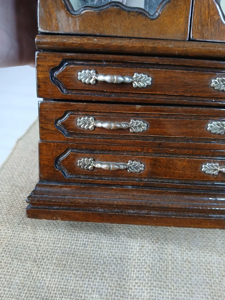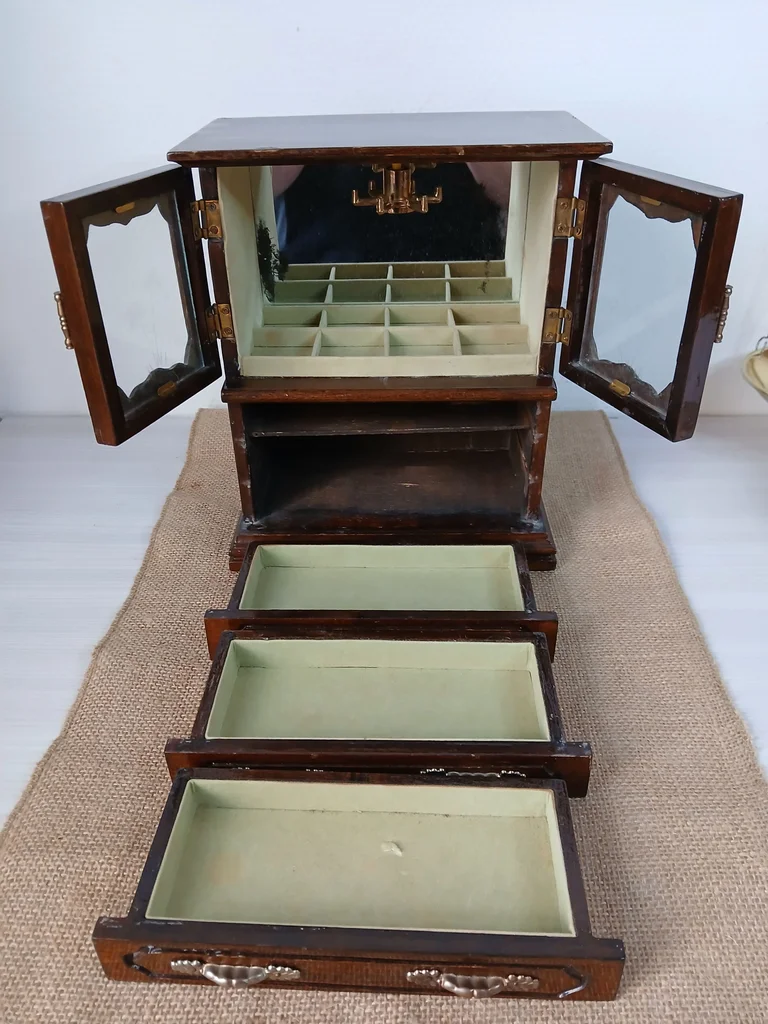 Coffre à bijoux En bois avec 3 tiroirs de rangement Et une vitrine De 25 cm hauteur De 12.5 cm sur 21 cm Ancien en bon etat Usure du temp Défaut d'usure du miroir