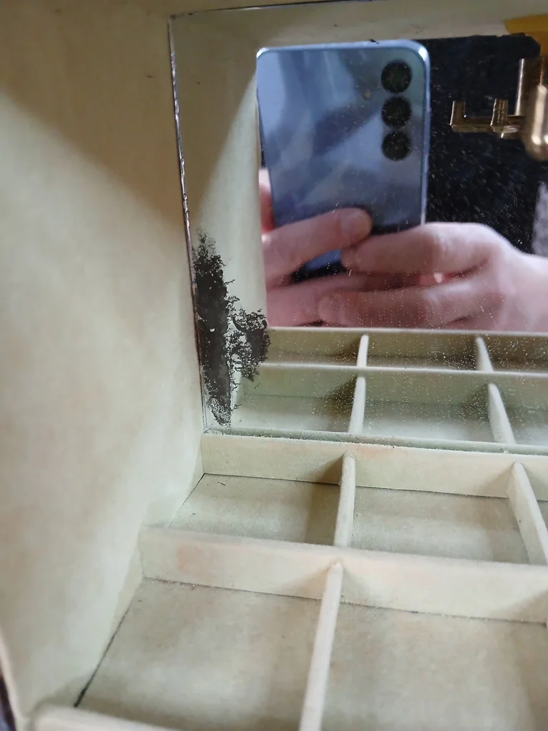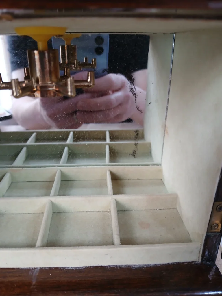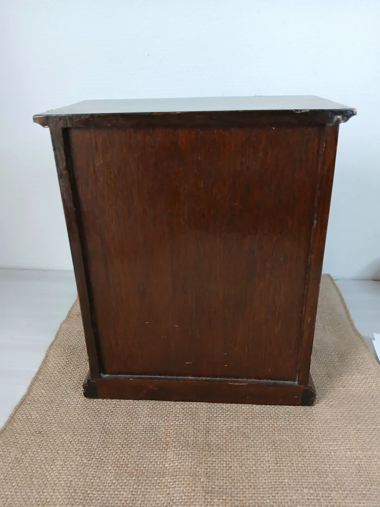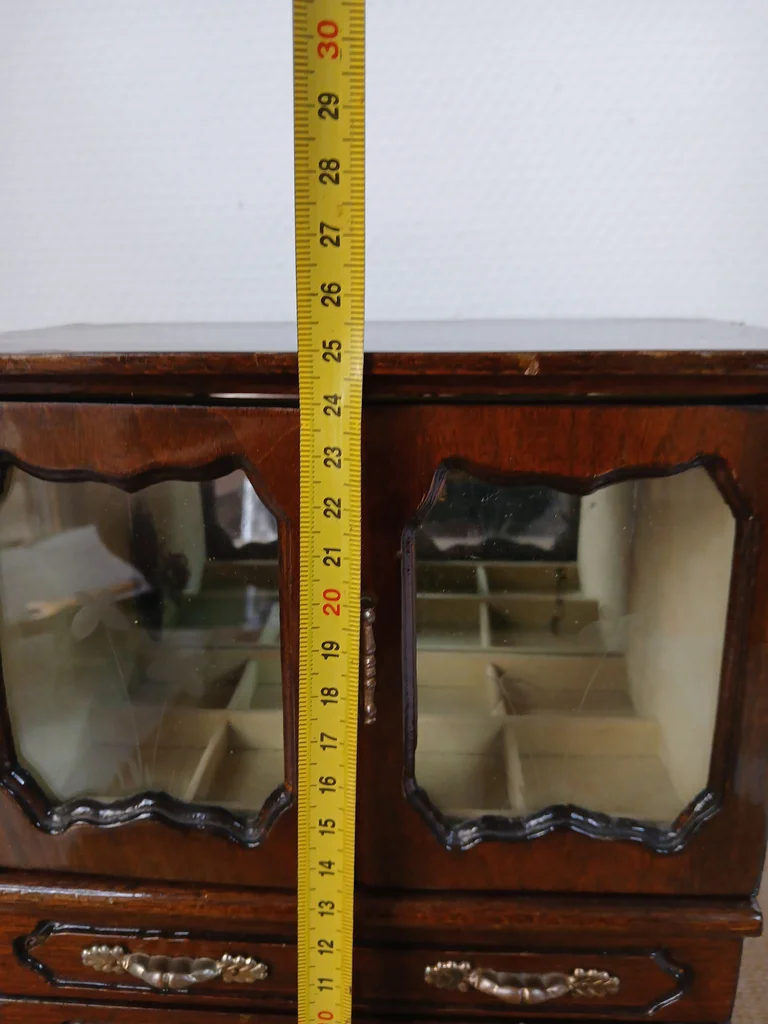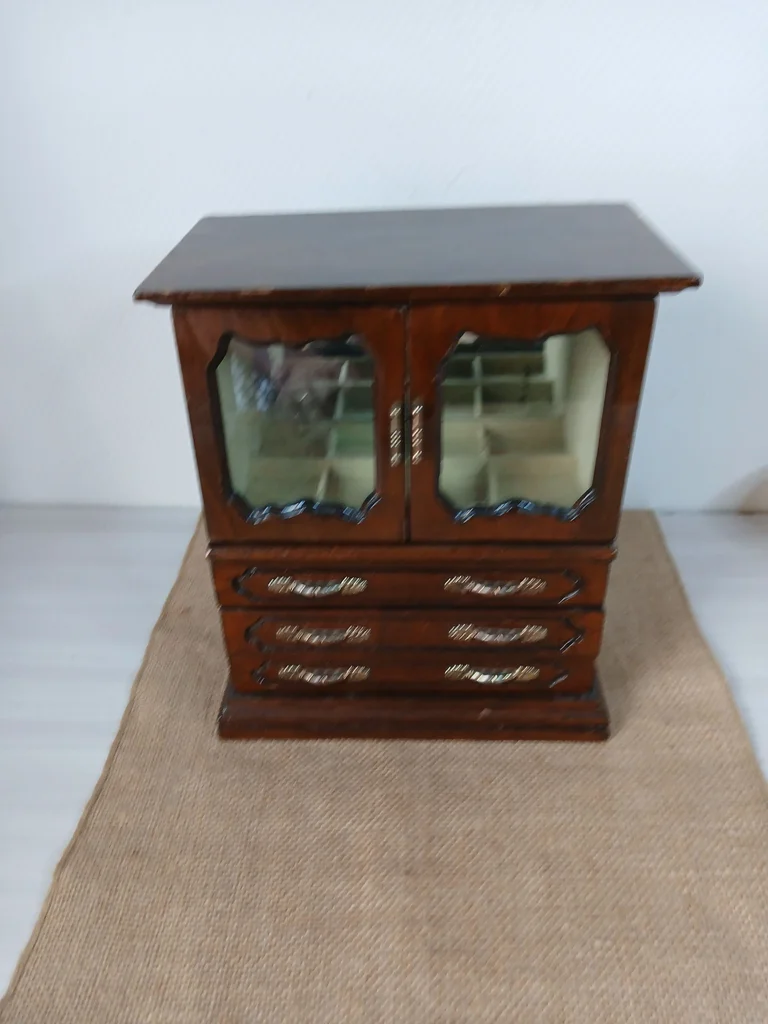 Coffre à bijoux En bois avec 3 tiroirs de rangement Et une vitrine De 25 cm hauteur De 12.5 cm sur 21 cm Ancien en bon etat Usure du temp Défaut d'usure du miroir